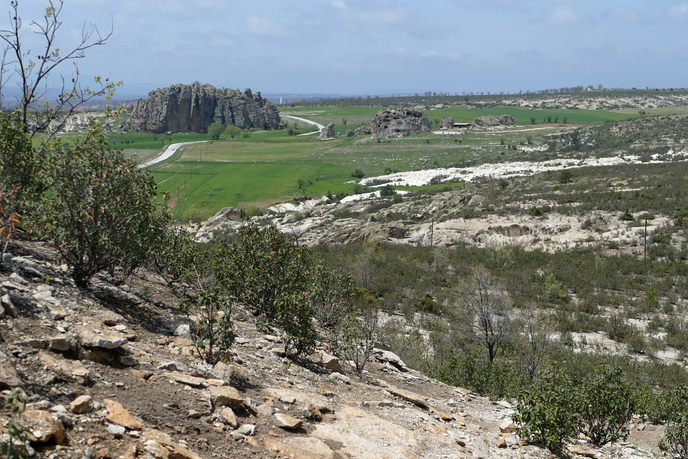 Die Sicht übers Tal: links von der Straße befindet sich eine spektakuläre Felsformation, und rechts der Straße, von hier aus eher unscheinbar erscheinend, der durchlöcherte Fels des Avdalaz Castle.