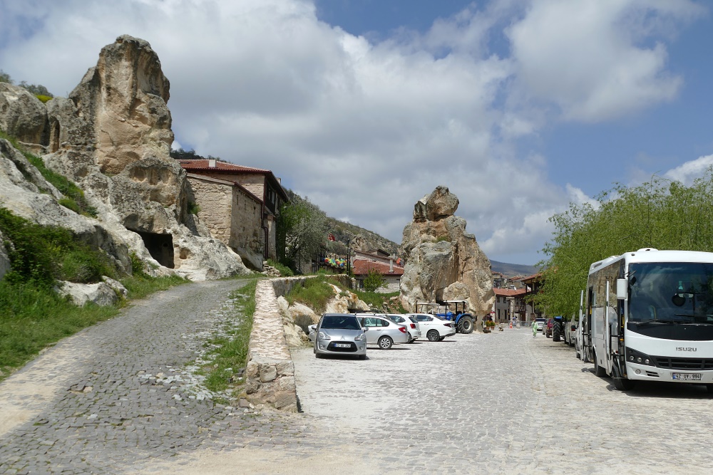 Als ich zurückkomme und weiter durch Ayazini schlendere, erlebe ich eine Überraschung: Während ich bisher nur einigen wenigen Einheimischen auf dem zentralen Platz begegnet bin und das Örtchen insgesamt eher ausgestorben wirkte, wird es auf der Straße nach Westen plötzlich sehr belebt. Es ist Wochenende und immer mehr Besucher strömen in den Westteil des Städtchens. Dort sind auch die meisten Attraktionen, wie Felsengräber, Felsenwohnungen und antike Kirchen, zu bewundern. Welchen Zustrom Ayazini gelegentlich erwartet, ist an dem riesigen Parkplatz am Ortsausgang zu erkennen. Auch eine Reihe von Restaurants, Cafes und Souvenirläden, die ich jetzt zum ersten Mal erblicke, säumen beide Seiten der Straße. Bei dieser zentralen touristische Attraktion wird auch Eiscreme vertrieben, die Kugel zu umgerechnet 50 Cents.