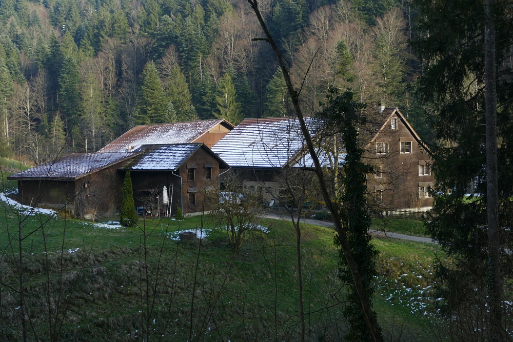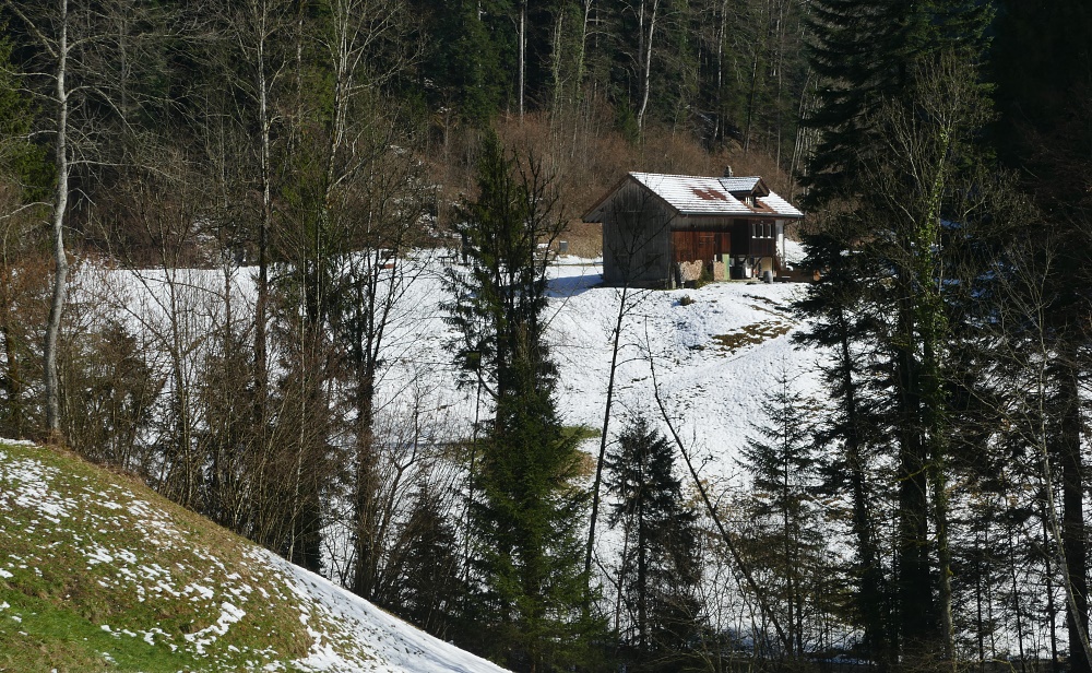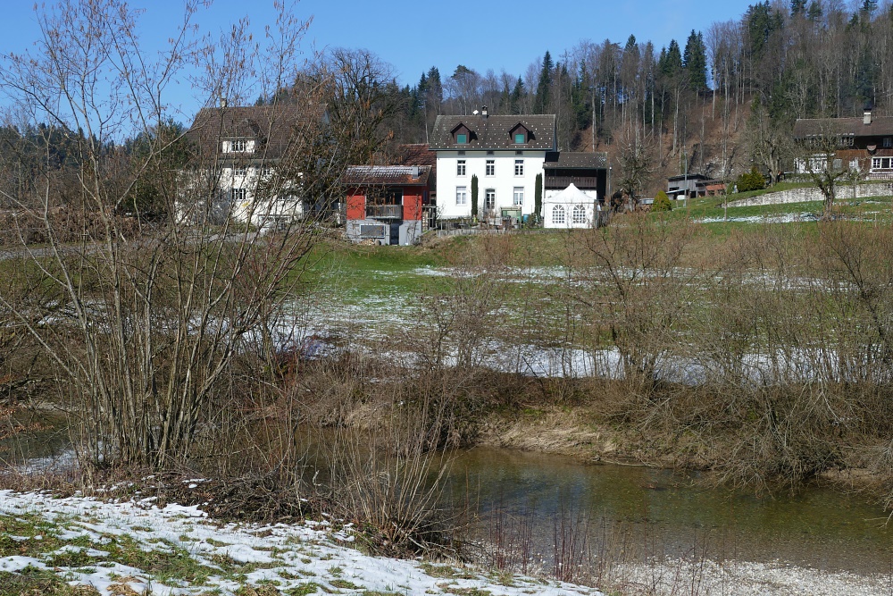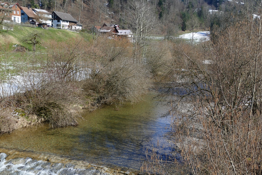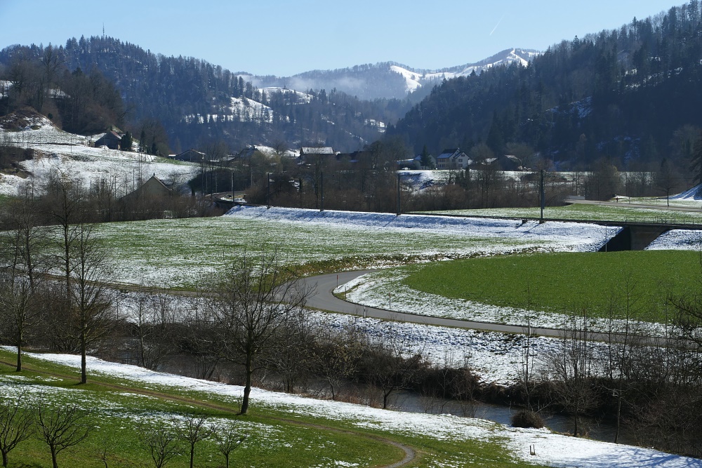Blick über die Töss Richtung Hörnli. Kurz zuvor ist noch Schnee gefallen, der jetzt aber langsam wegtaut.