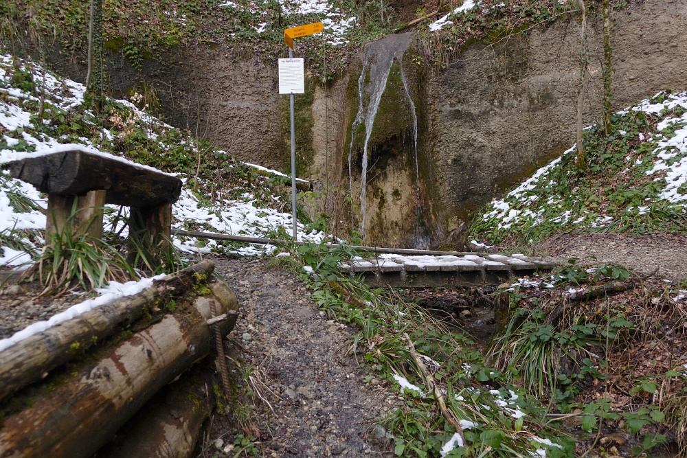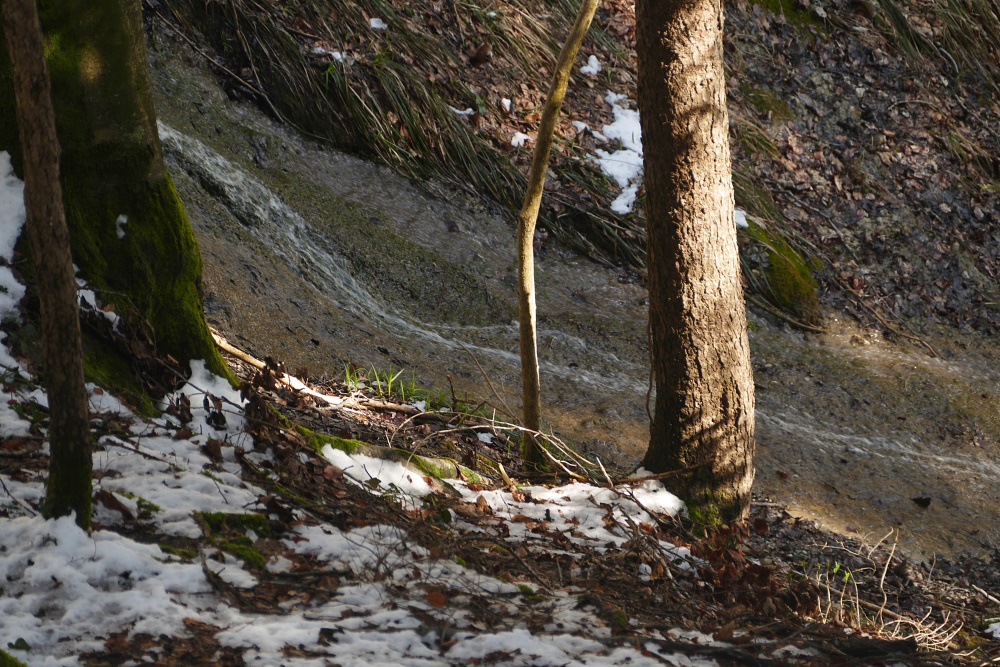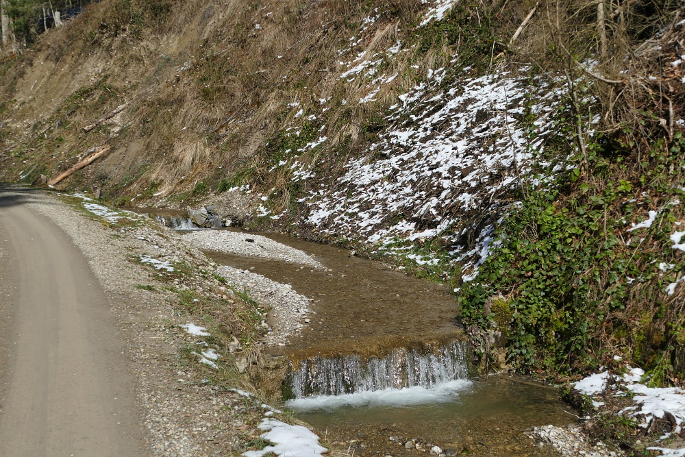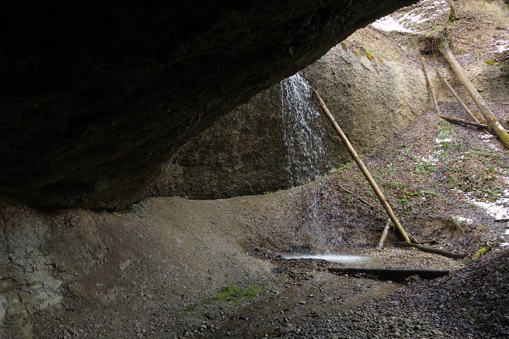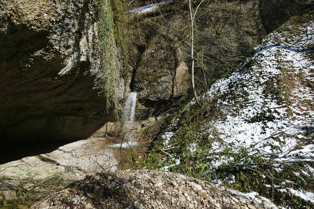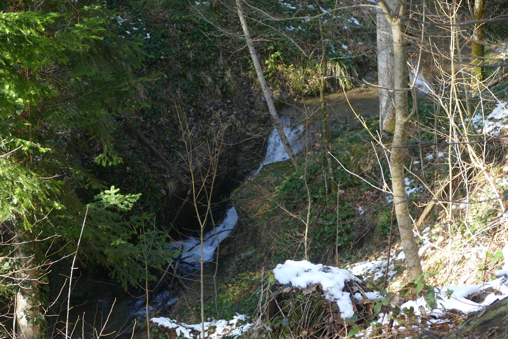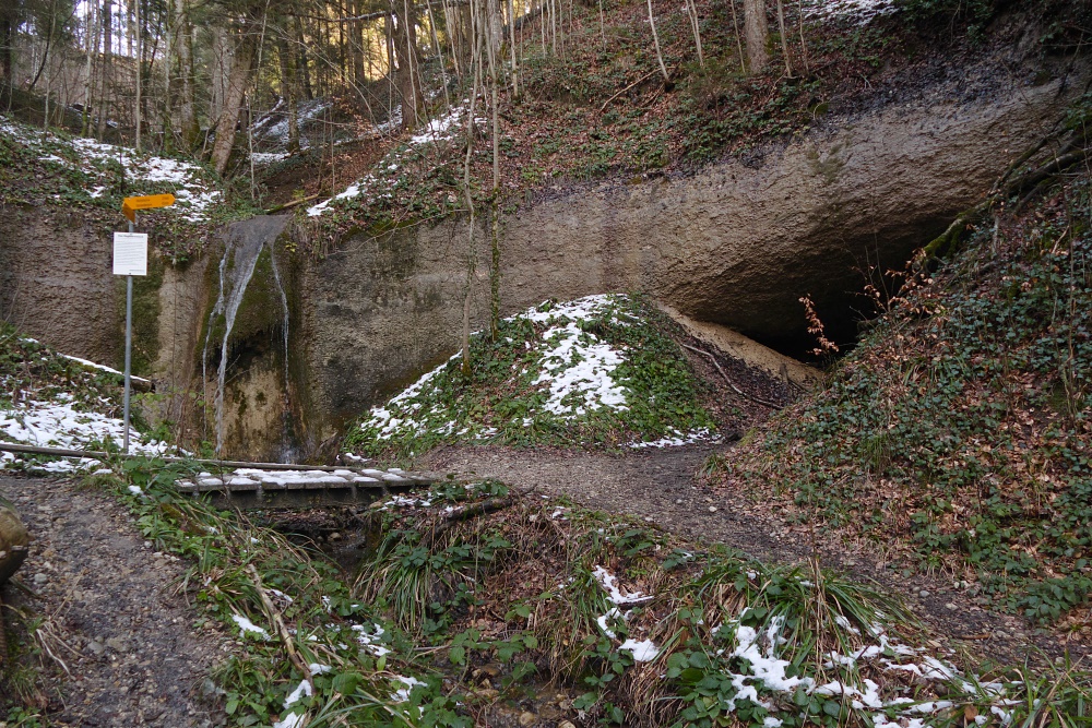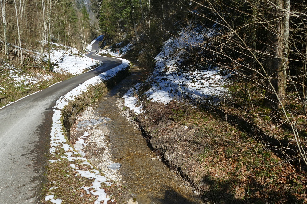 Der Nideltobelbach verläuft nun auf der anderen Straßenseite, wo er an dieser Stelle aus einem Felsspalt hervorstürzt.