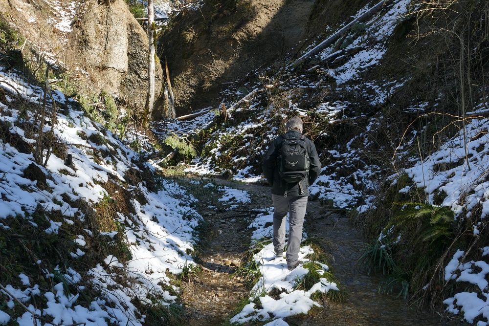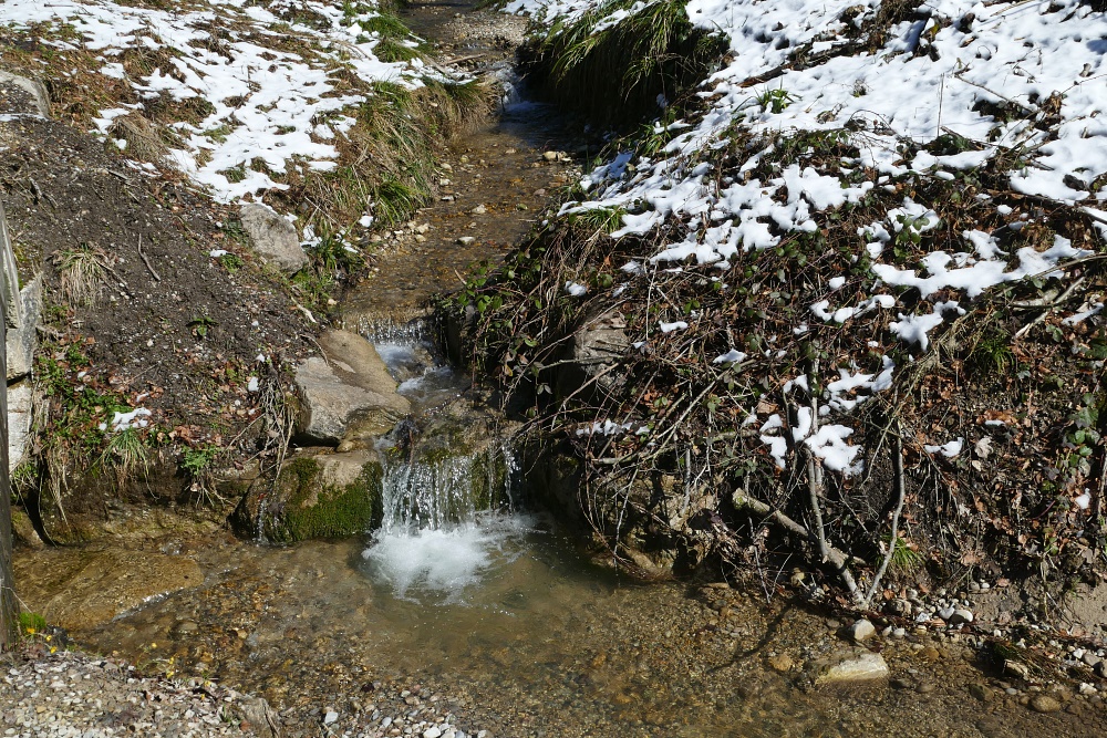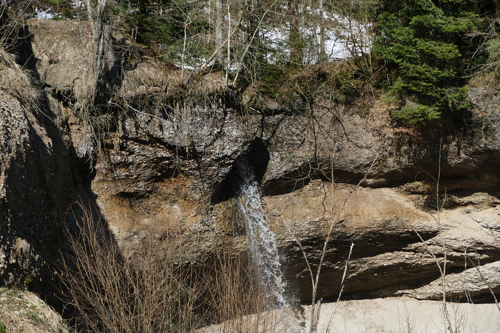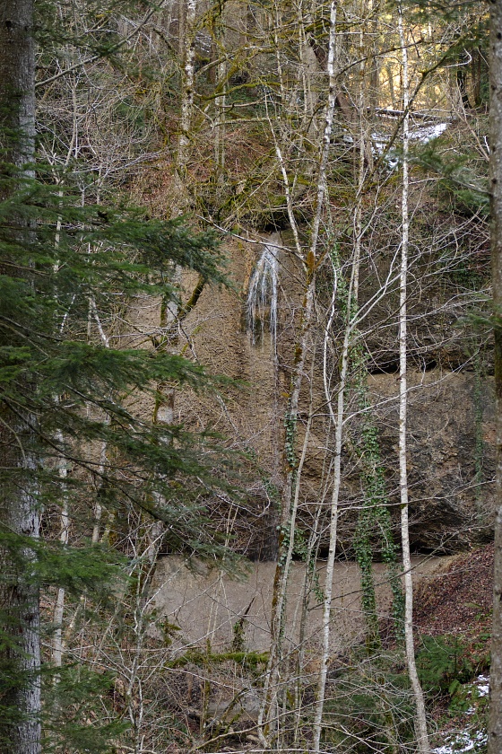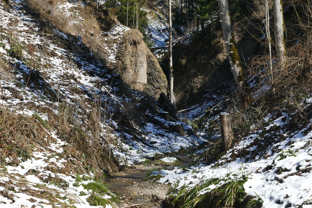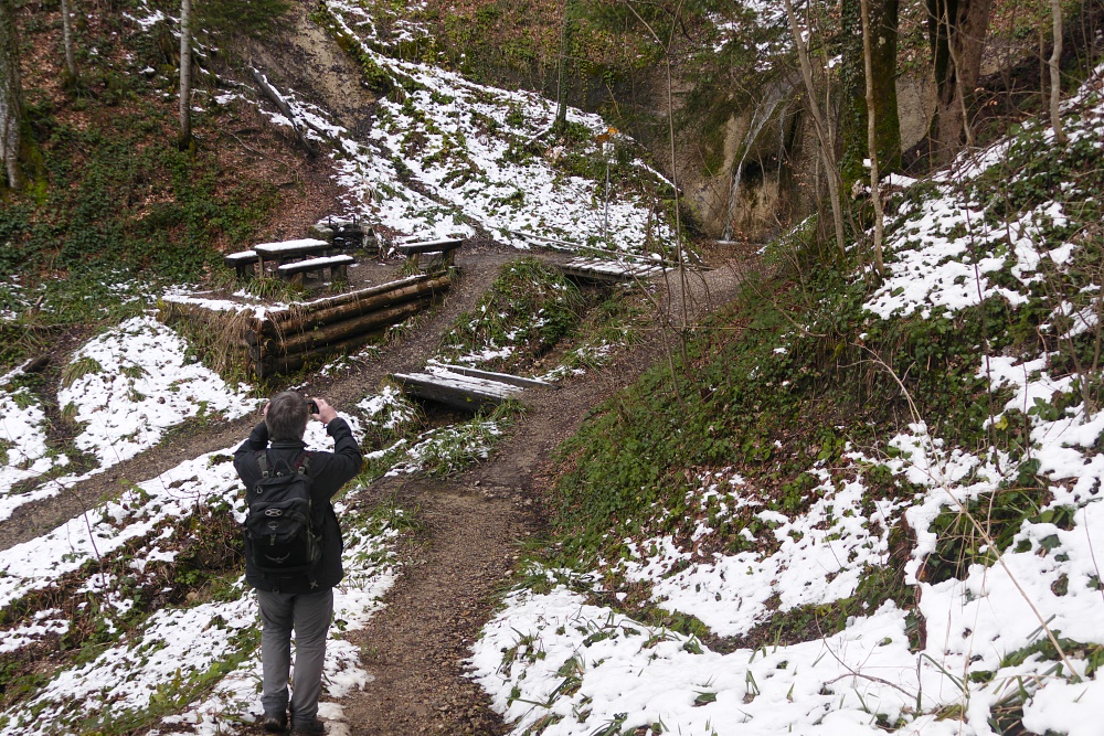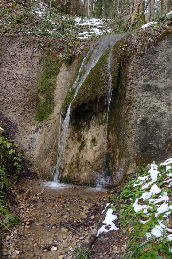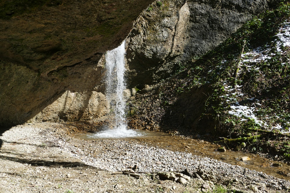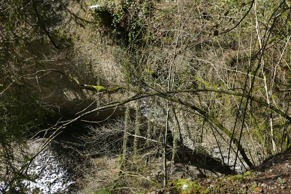 Der Nideltobelbach verläuft nun auf der anderen Straßenseite, wo er an dieser Stelle aus einem Felsspalt hervorstürzt.
