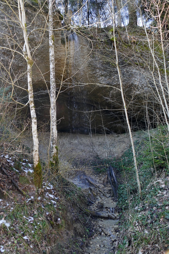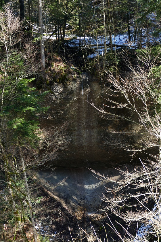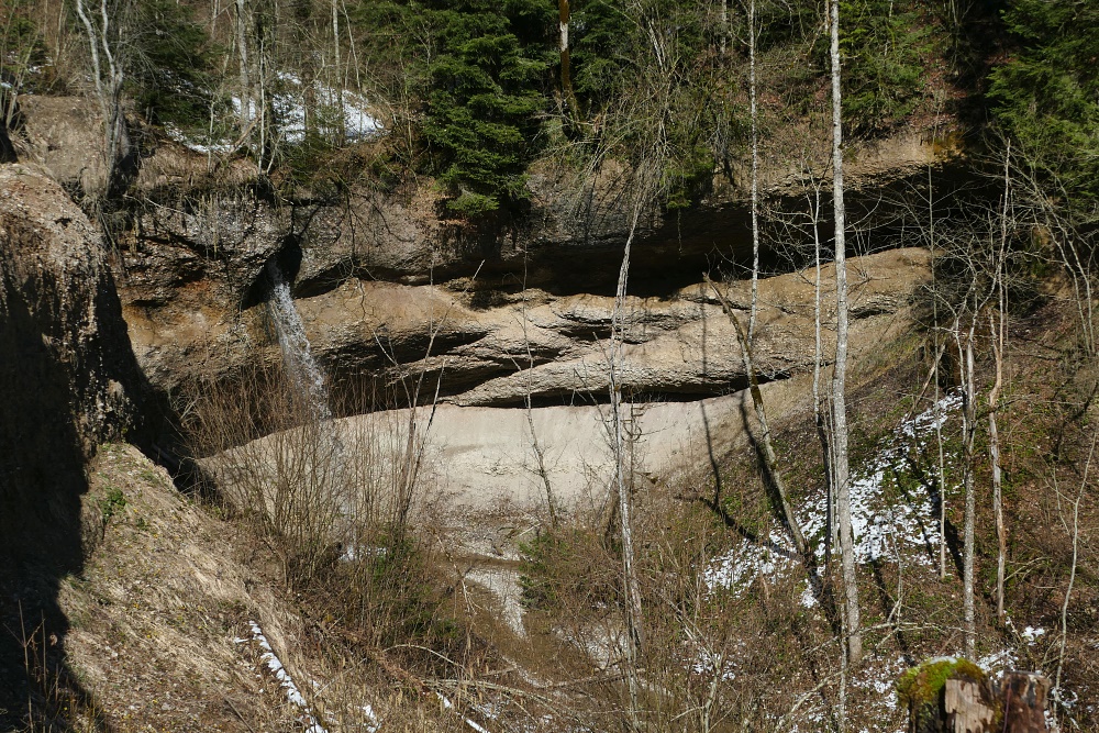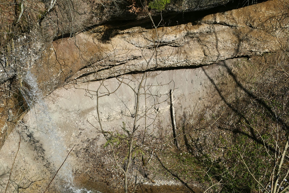 Einen halben Kilometer weiter bietet sich ein weiterer spektakulär Anblick: Gleich zwei Wasserfälle stürzen sich über einen ausgehöhlten Überhang, zum einen gespeist durch den Schindletholzbach, zum anderen durch die Wasser des Feietbaches.
