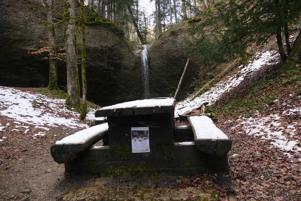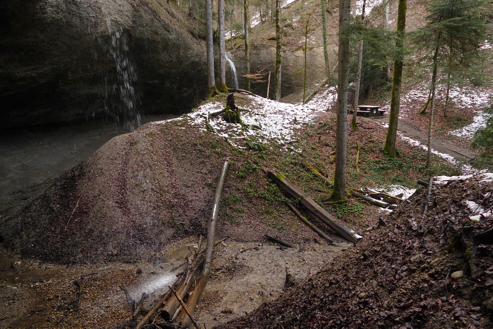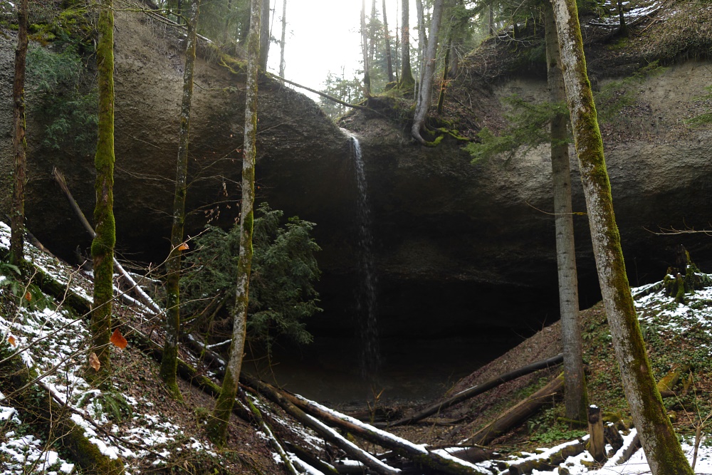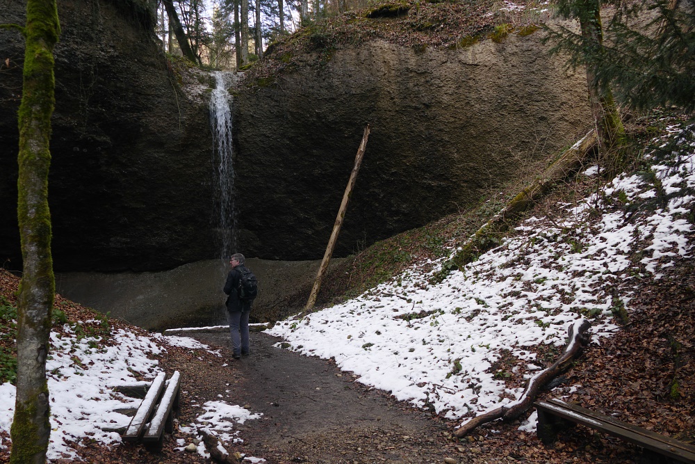 Noch imposanter ist ein paar Meter weiter ein Wasserfall des Nideltobelbaches, der durch eine Felsöffnung in einen weiten Kessel hinunterstürzt.