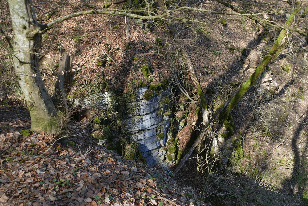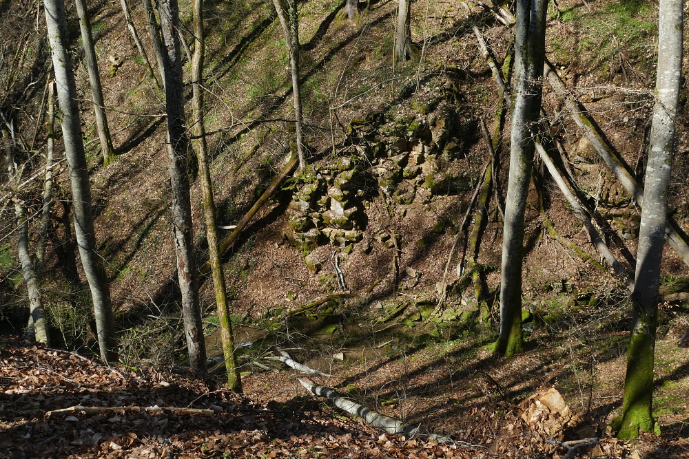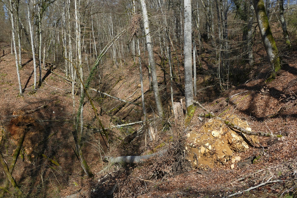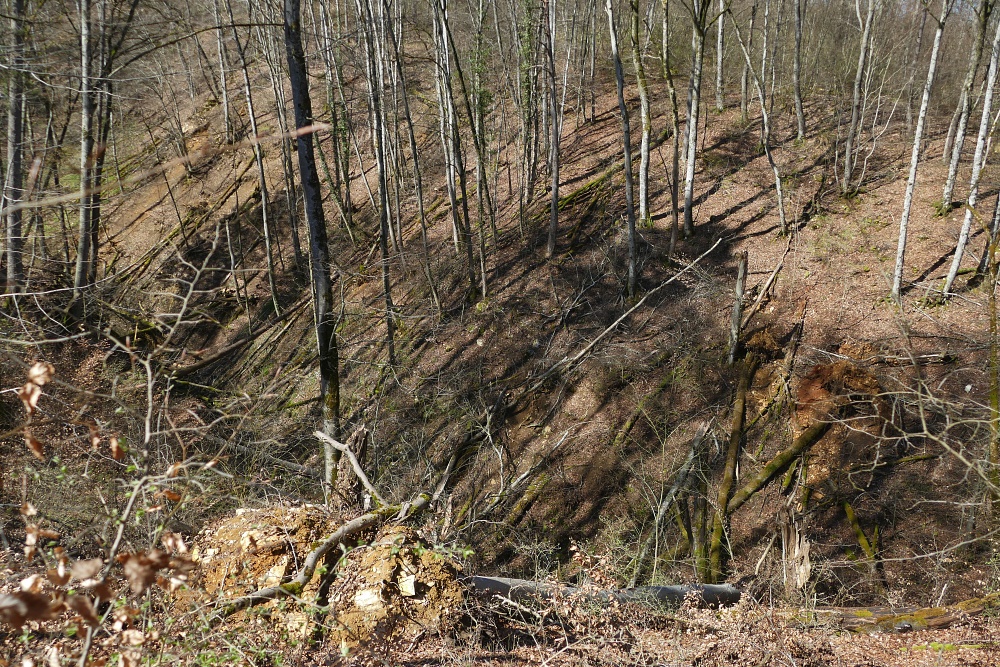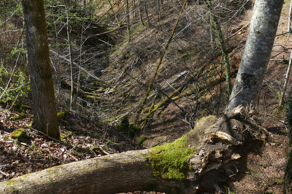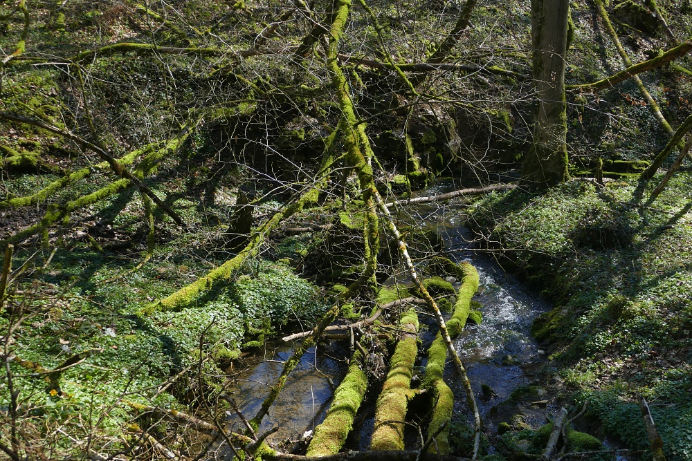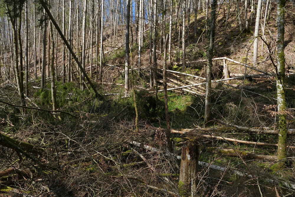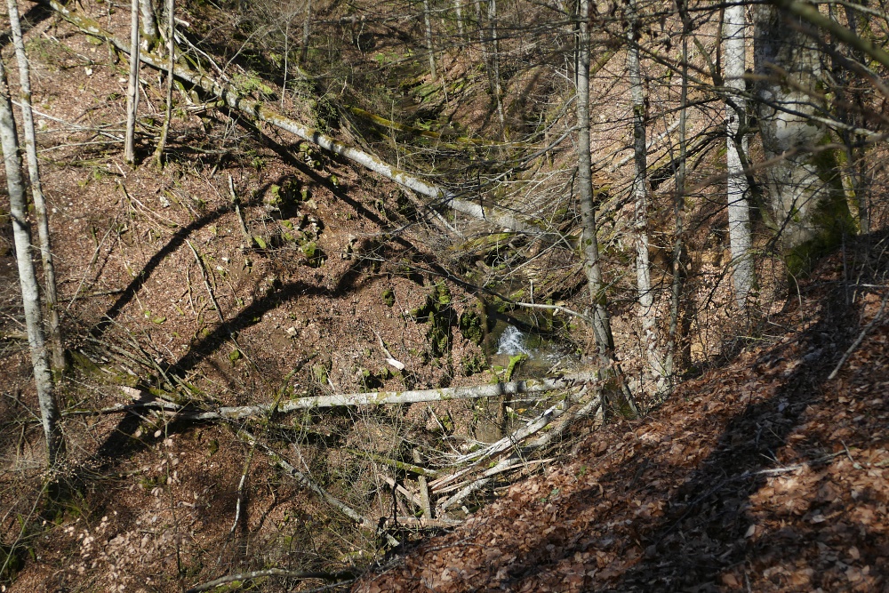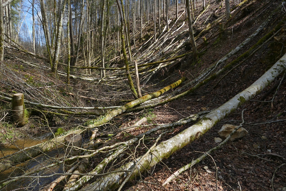Völlig unvermittelt stehe ich vor den Zeichen massiven Windbruches. Die ersten Meter ist es noch relativ einfach, die blockierenden Baumstämme zu überwinden, aber bereits kurz darauf ist der Windbruch so dicht, dass ein solches Unterfangen lebensgefährlich wäre. Später, am Ausgang der Schlucht, bemerke ich ein Warnschild, aber aus Richtung Eigeltingen fehlt ein solches.