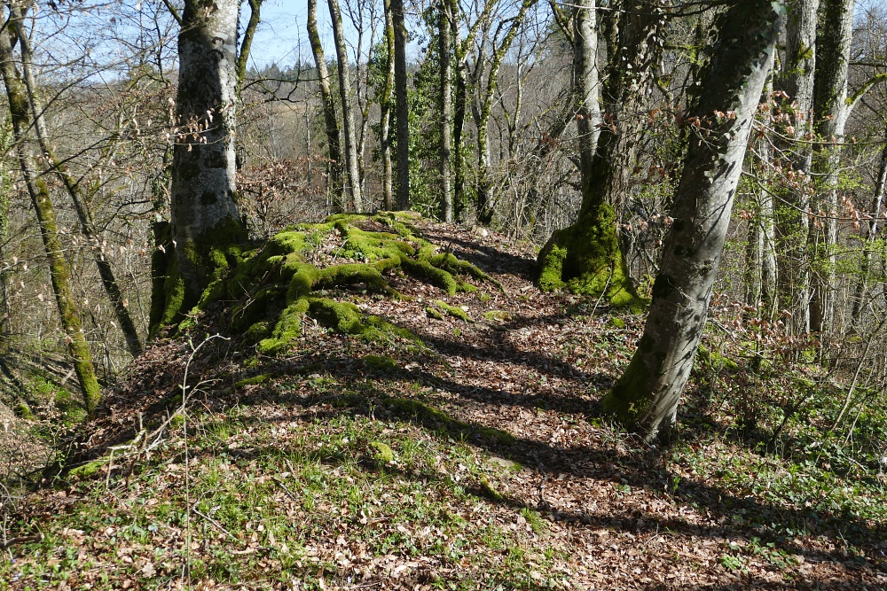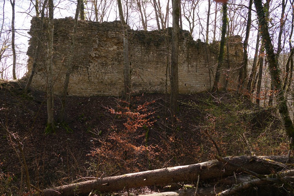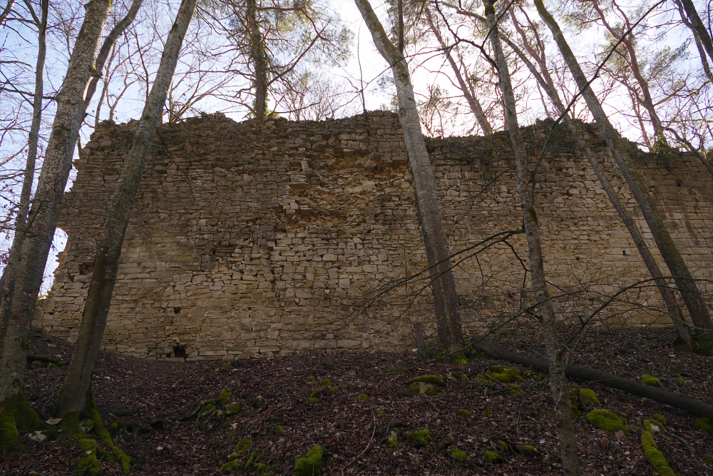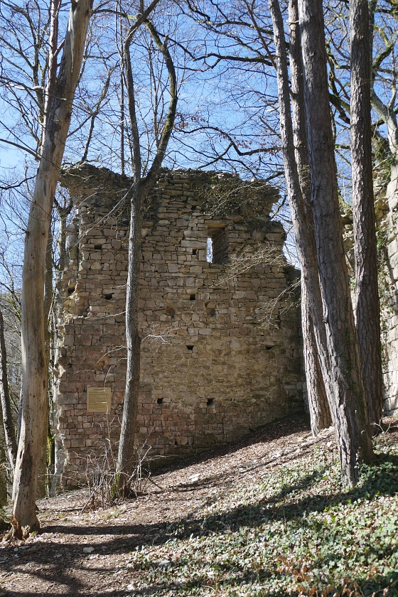 Beim Parkplatz taucht der Wanderweg wieder in den Wald ein und führt nach kurzer Strecke zur Ruine Tudoburg.