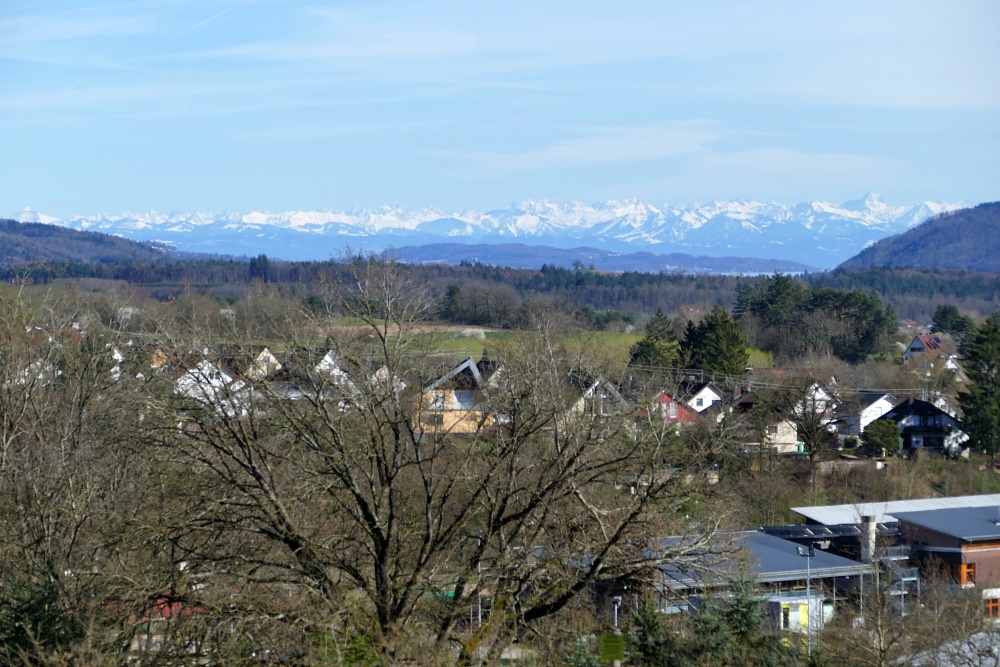 Erst vor Eigeltingen treffe ich wieder auf offenes Gelände, sogar mit Alpensicht.