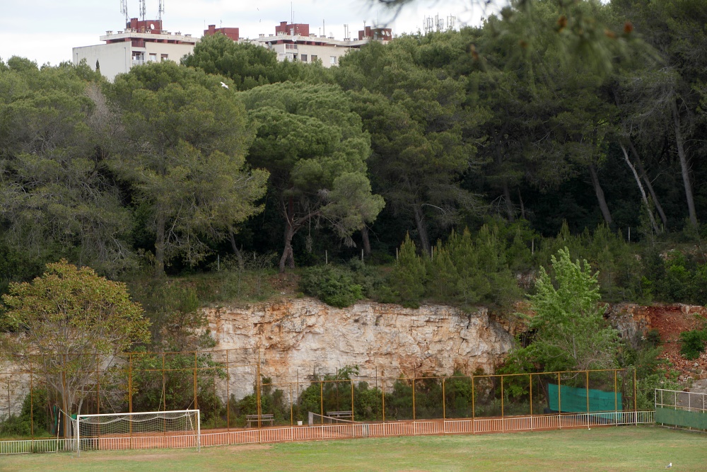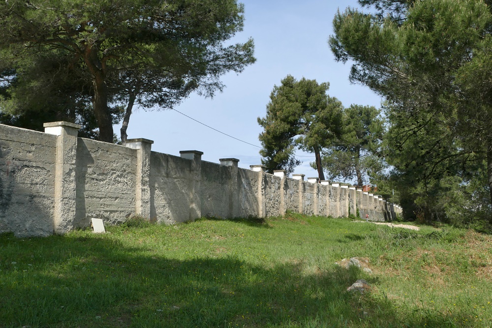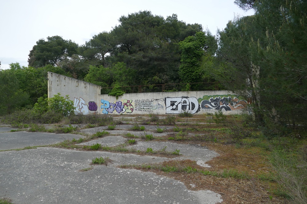 Eine leicht überwindbare Mauer, vermutlich ein Relikt aus früheren Militäranlagen trennt das Gelände ab