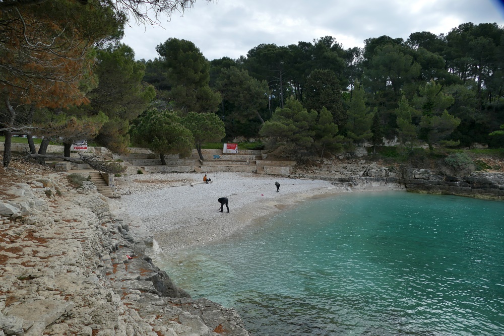Wir übernachten in der Nähe von Pula und uns steht ein ganzer Tag für die Erkundung von Pula und deren Umgebung zur Verfügung. Am Strand entlang geht es nun, vorbei an Fische jagenden Kormoranen, am Strand entlang nach Osten.