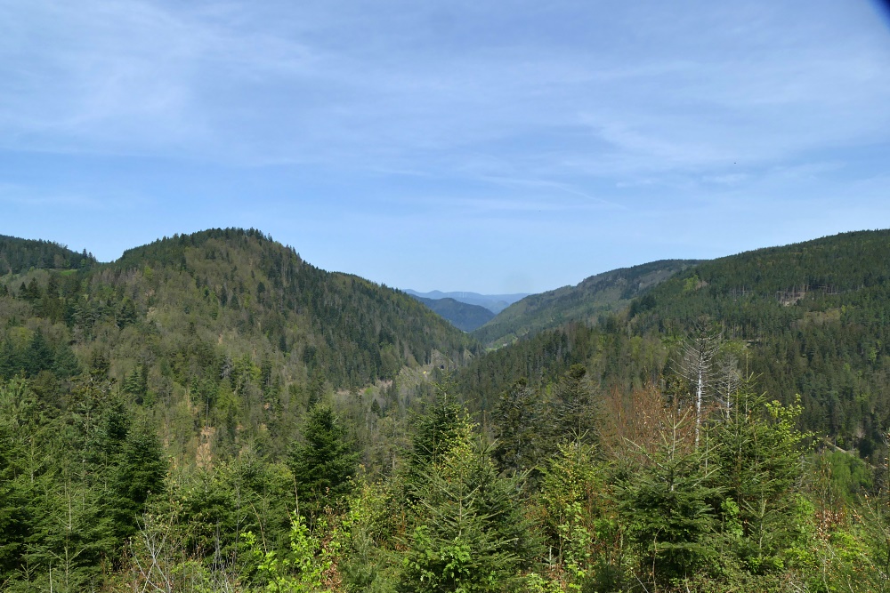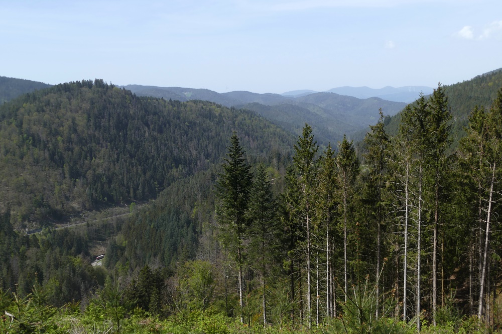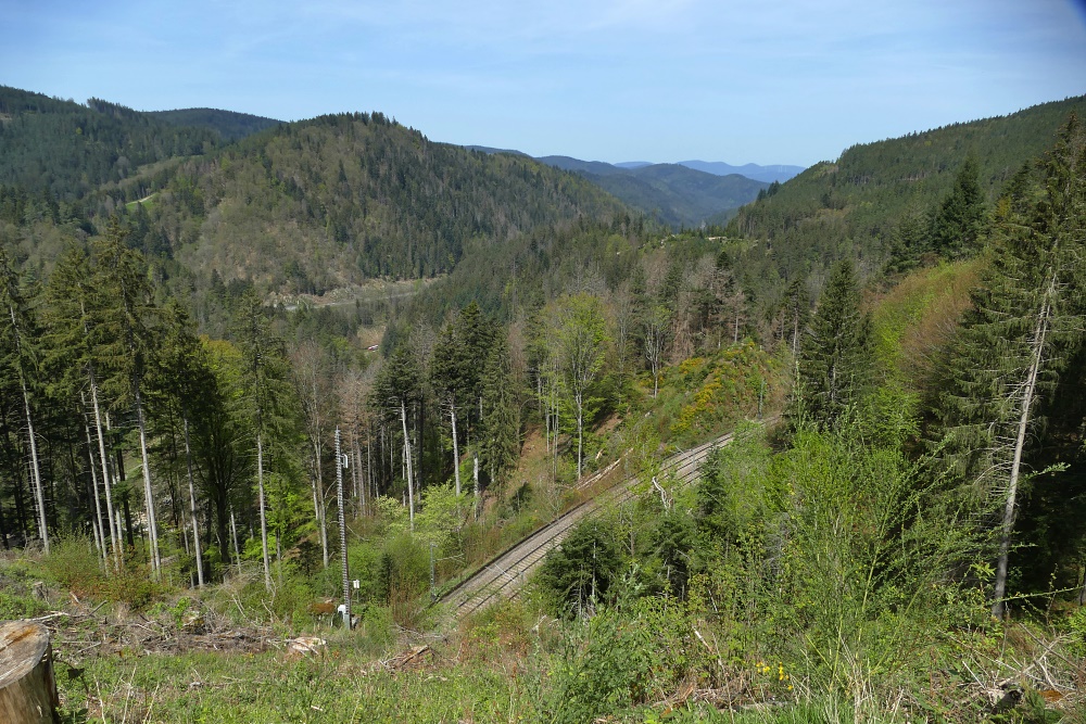 Blick über den Schwarzwald nördlich von Triberg. Sobald die Sicht freier wird, erkennt man auch die Streckenführung der Schwarzwaldbahn.