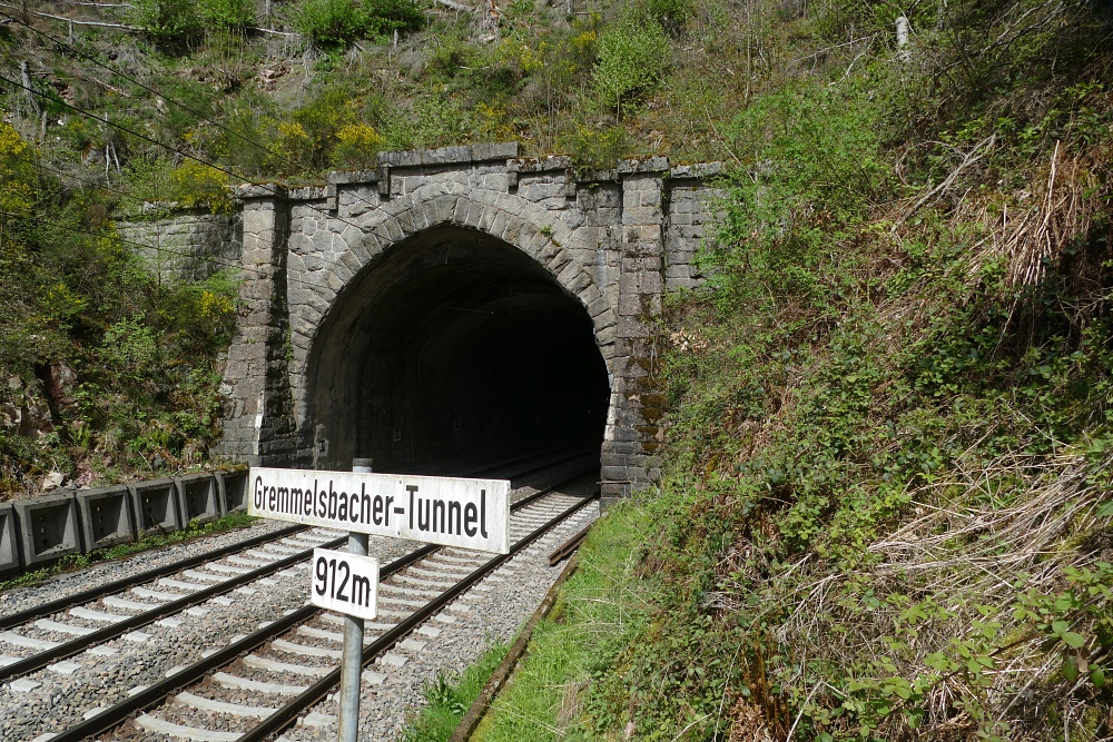 ein Zug hat den Gremmelsbacher-Tunnel hinter sich.