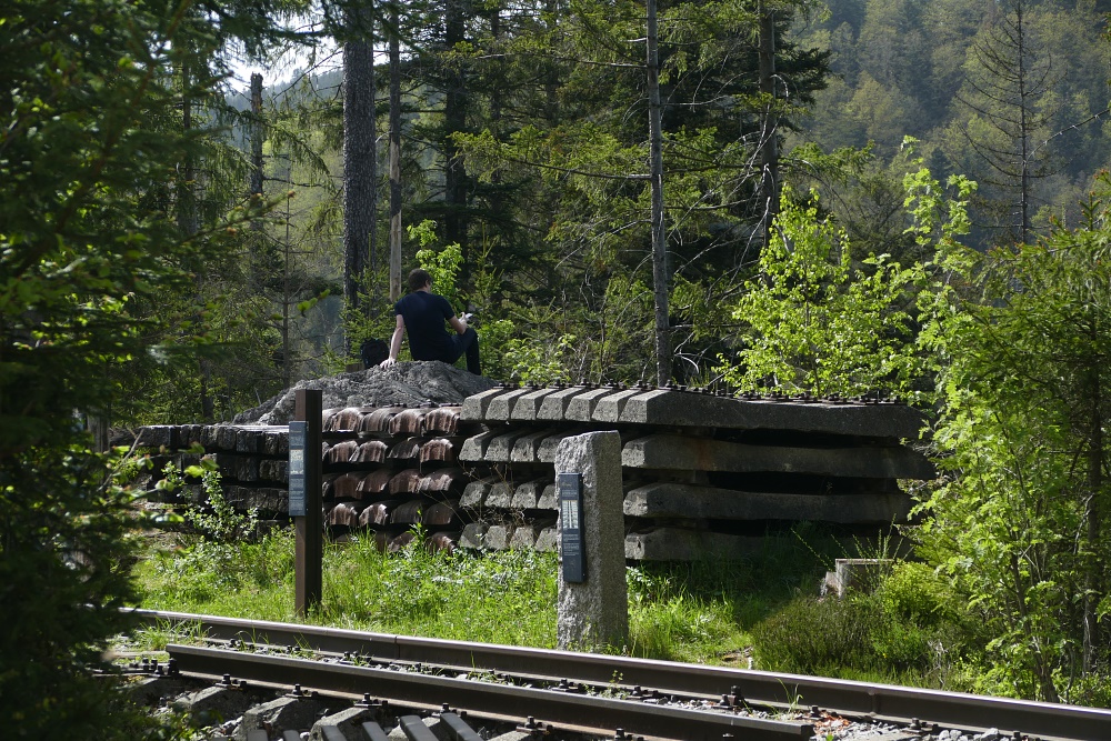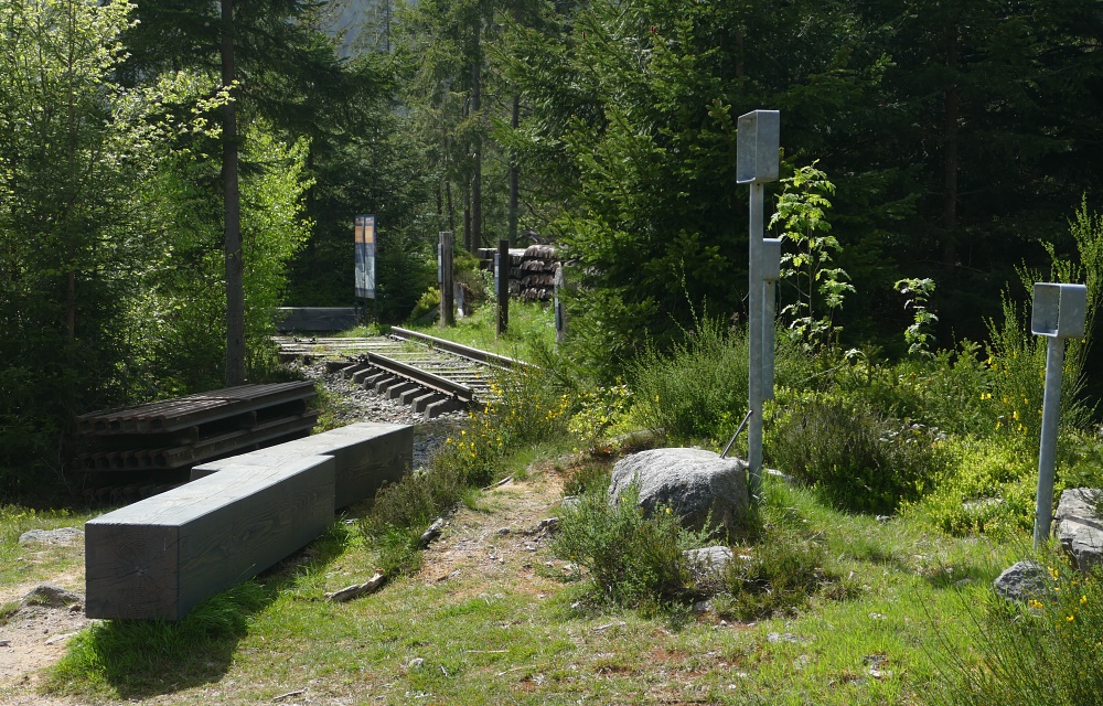 an der Informationstafel Nr. 3: Bahnschienen und Schwellen