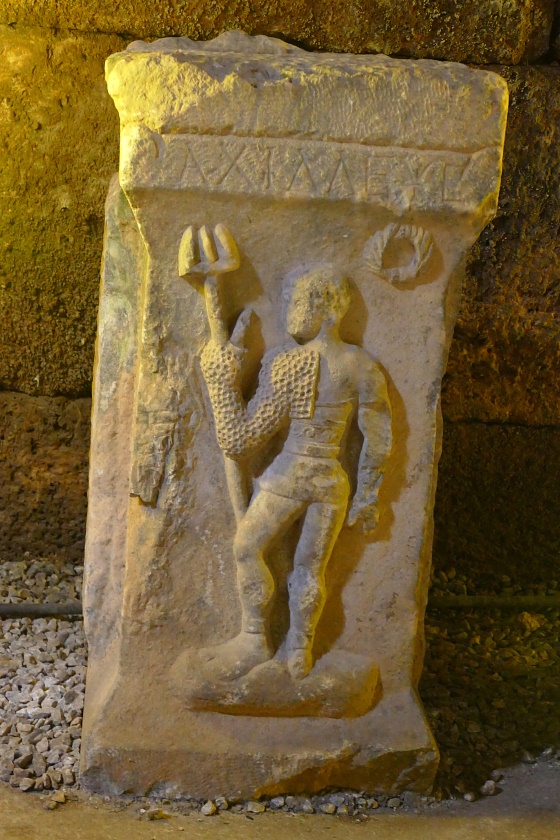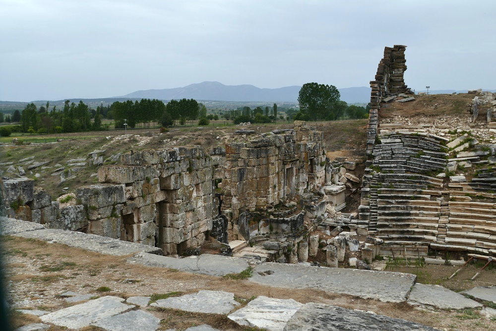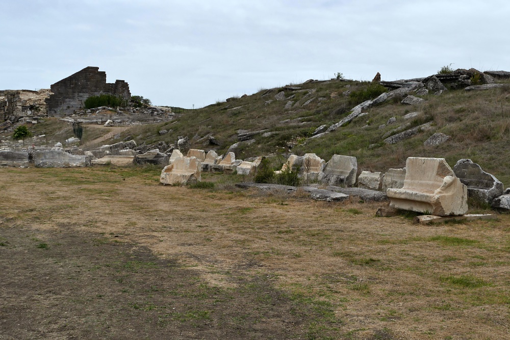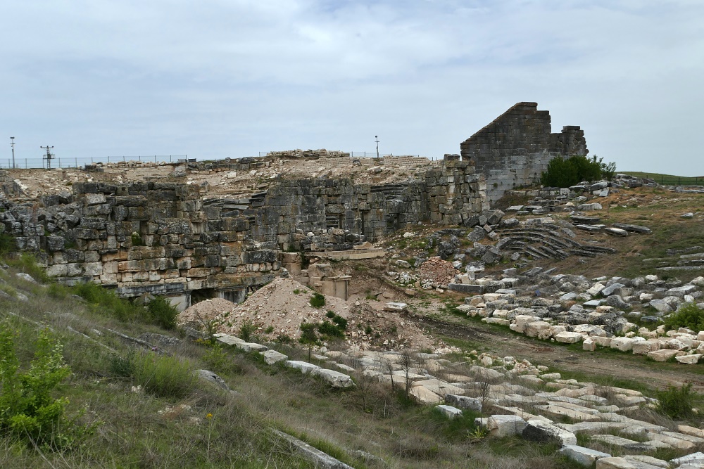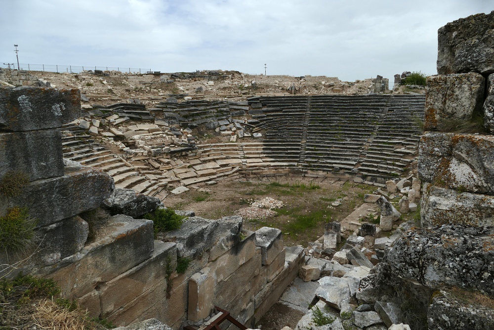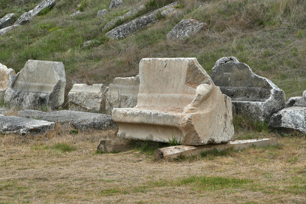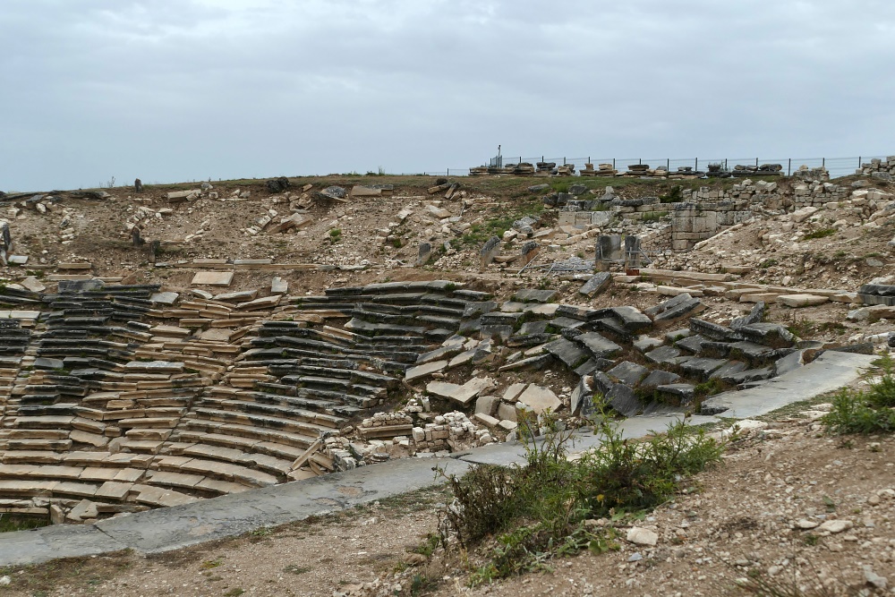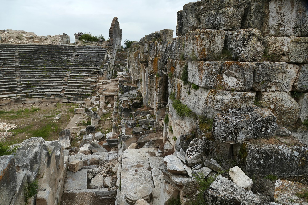 Sitzreihen im Theater; oberhalb des oben sichtbaren Rundganges waren früher weitere Sitzreihen, die aber nicht in den Hang gebaut worden waren, sondern eine eigene Stützstruktur hatten, und deswegen im Laufe der Zeit verschwanden.