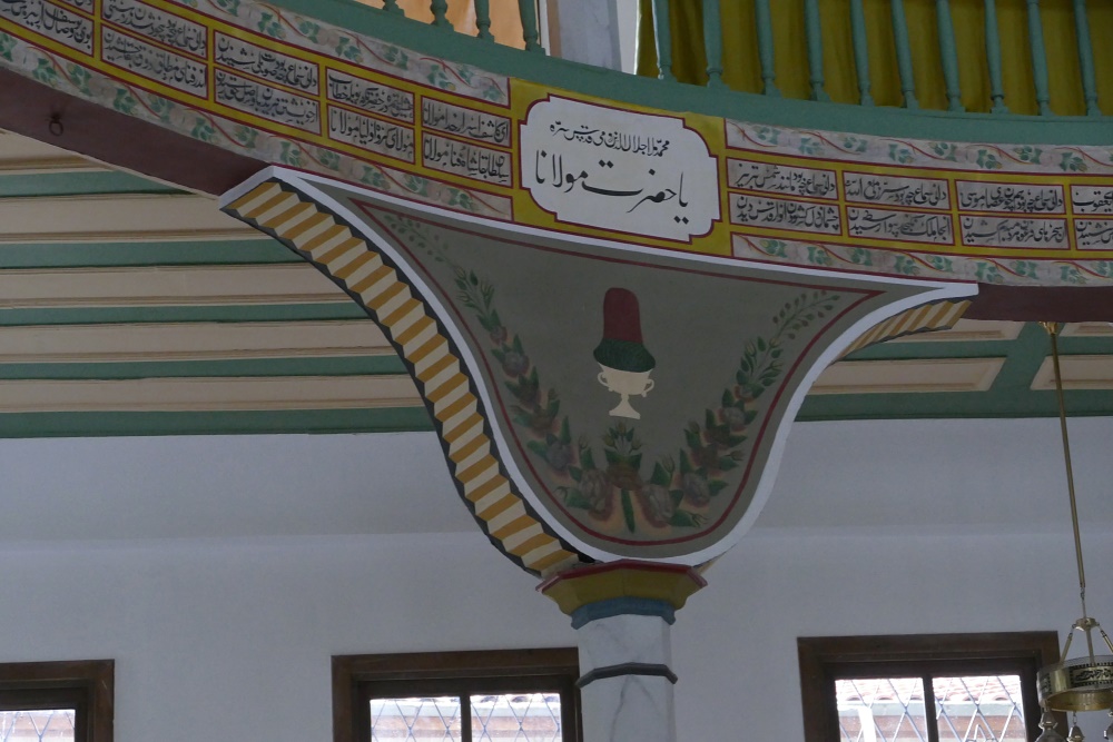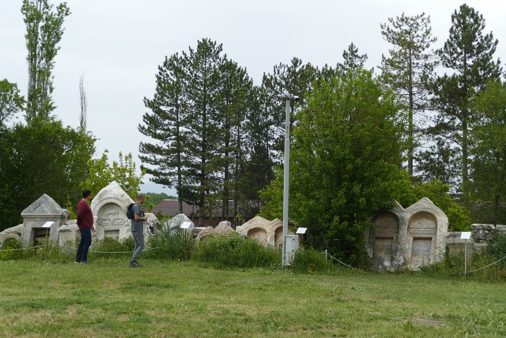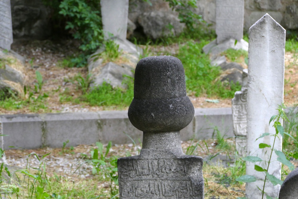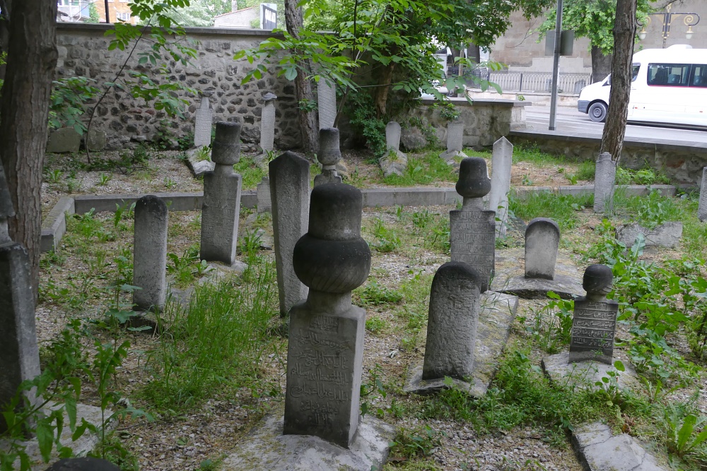 Grabstellen von Derwischen hinter der Moschee sind an den typischen Kopfbedeckungen erkennbar.