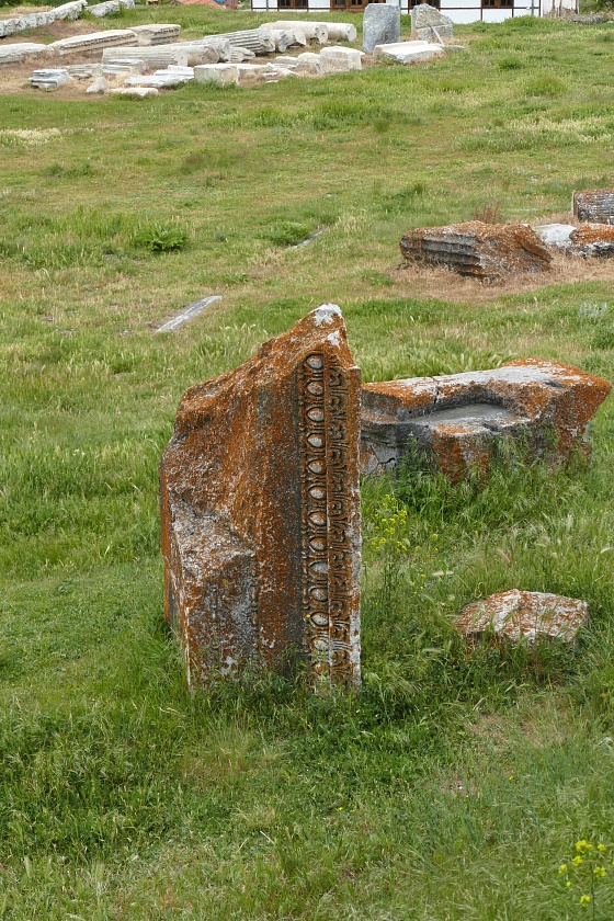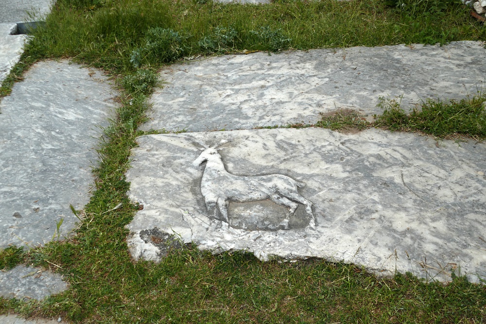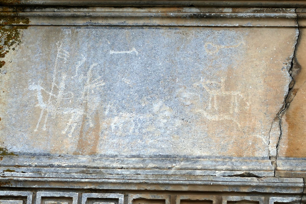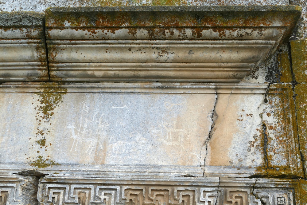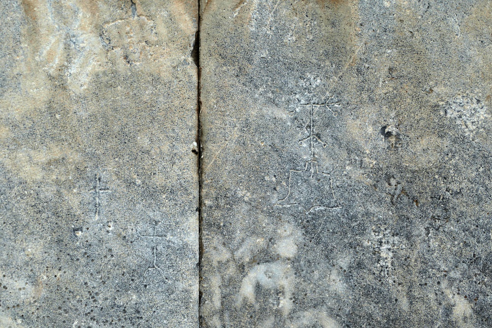 Zeichnungen von Kriegern und Reitern, die von den Tataren im 13. Jhdt. eingeritzt wurden. Damals wurde der Tempel, der zwischenzeitlich als Kirche benutzt worden war, von den eingedrungene Mongolenstämmen als Festung benutzt.