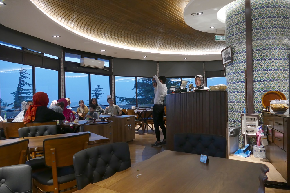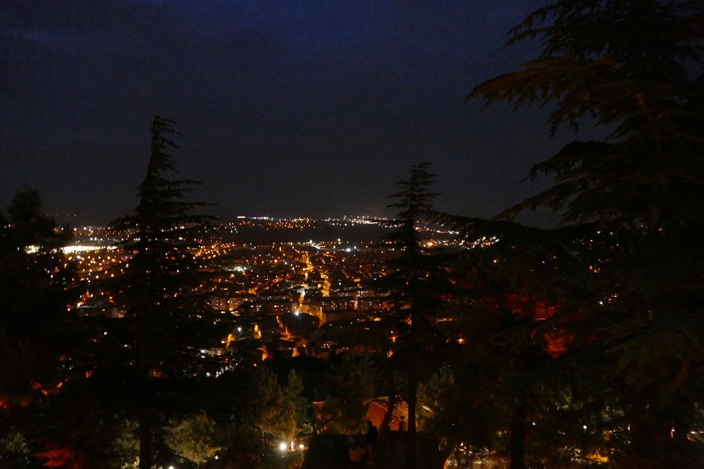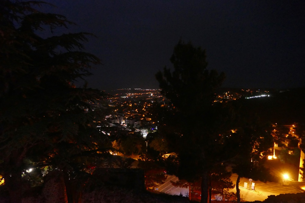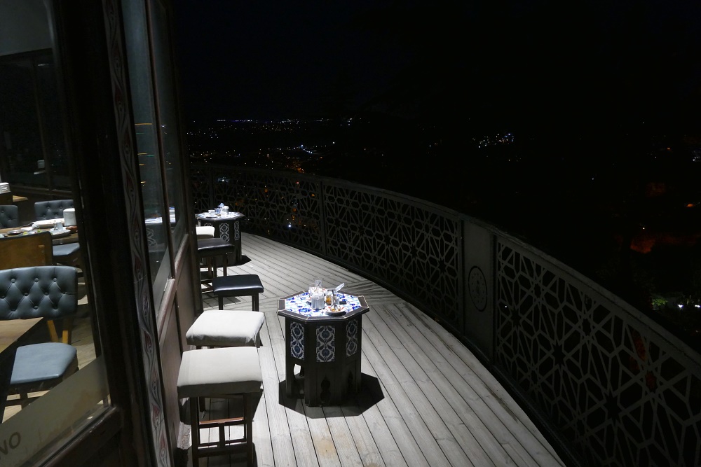 Abends treibt uns der Hunger nochmals aus dem Hotel. Nachdem wir im Dreh-Restaurant auf der Burg so gute Erfahrungen gemacht haben, wollen wir dieses Restaurant auch noch mal in der Dunkelheit versuchen. Das Restaurant ist durch Verglasung vor Wind und Wetter geschützt, man kann aber auch draußen auf dem holzbeplankten Umgang speisen.