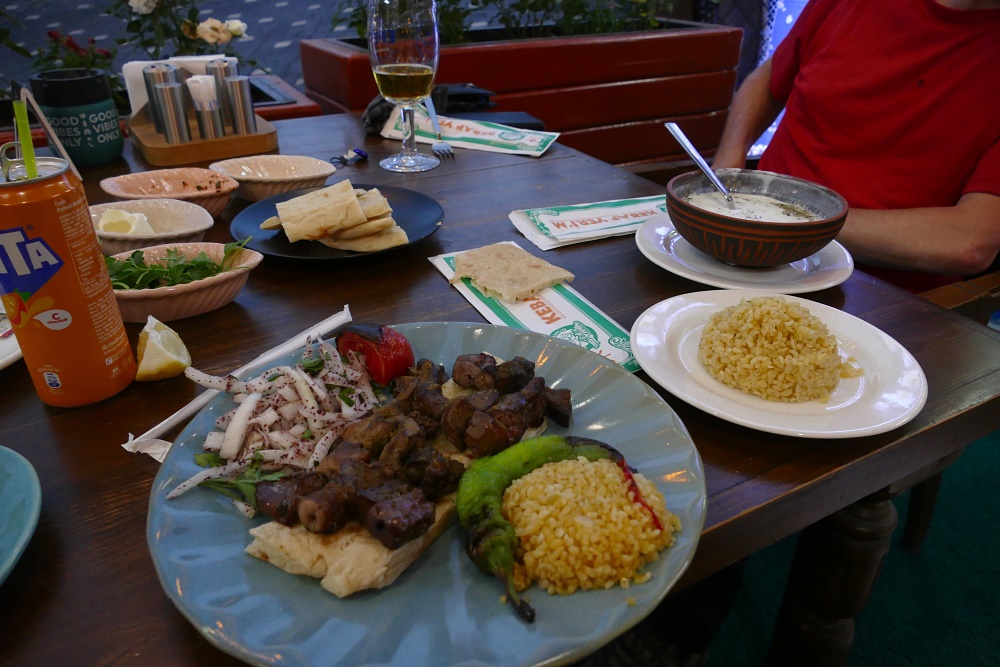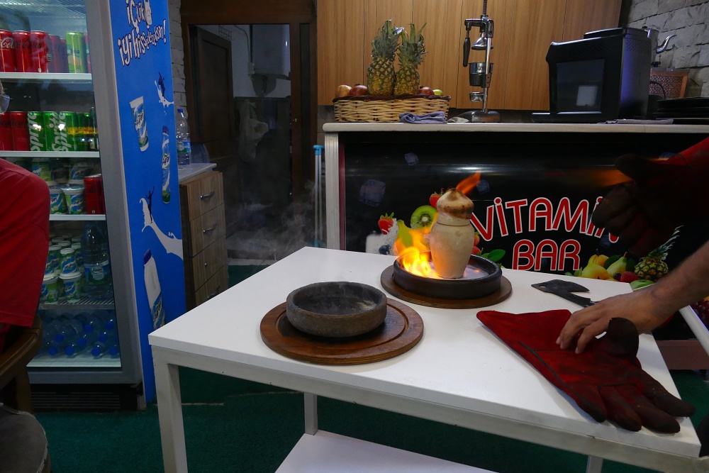 feuriges Abendessen in Göreme (Pottery Kebab), mit einem Tontopf, der erst als beeindruckende Präsentation am Tisch aufgebrochen wird.