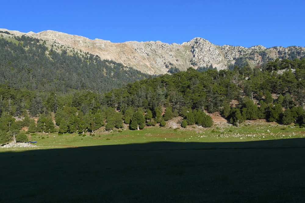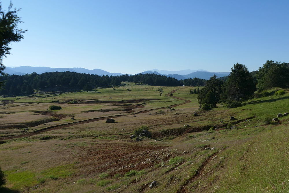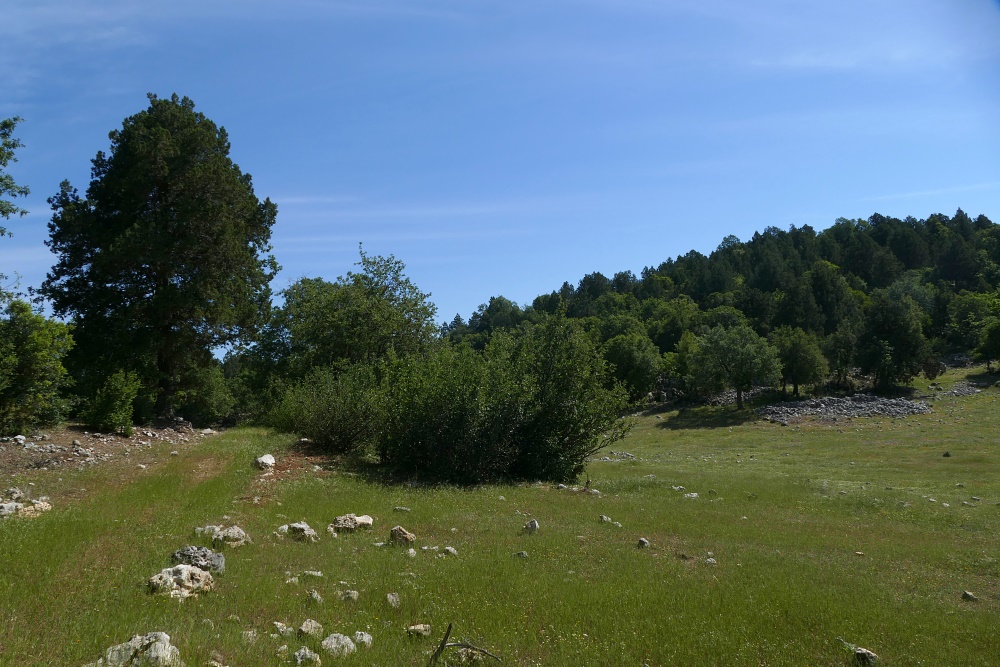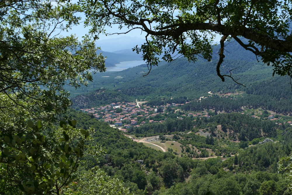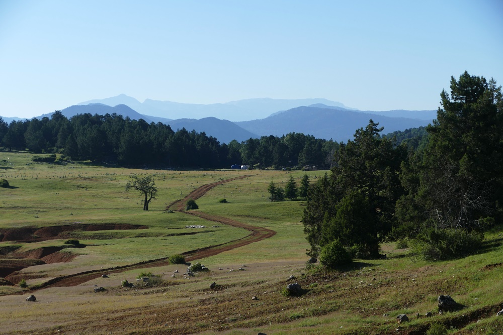 Immer wieder tauchen im Wald solche kleine oder größere, bewirtschaftete Wiesen auf. Hier ist zum ersten Mal mein heutiges Ziel, das in der Ebene liegende Yukari Gökdere zu sehen.