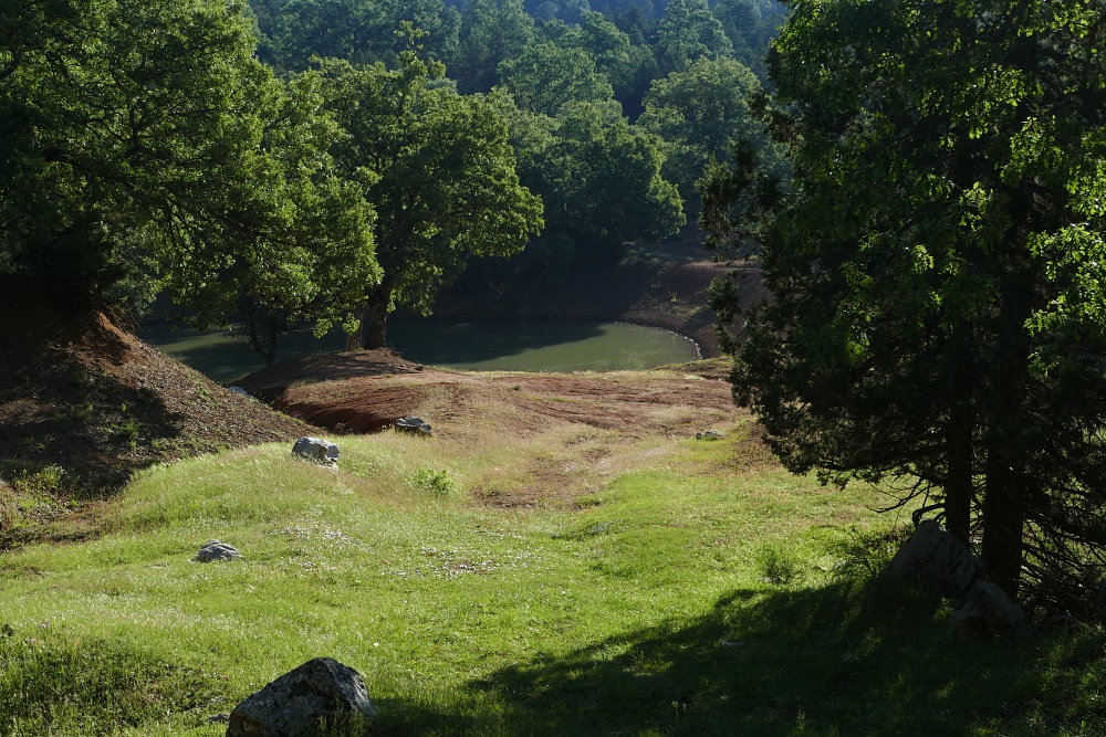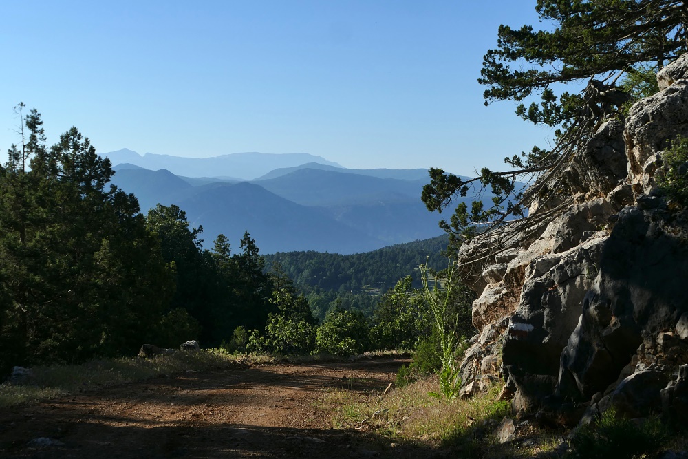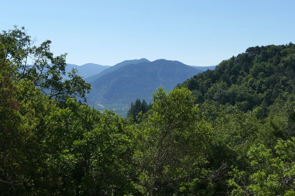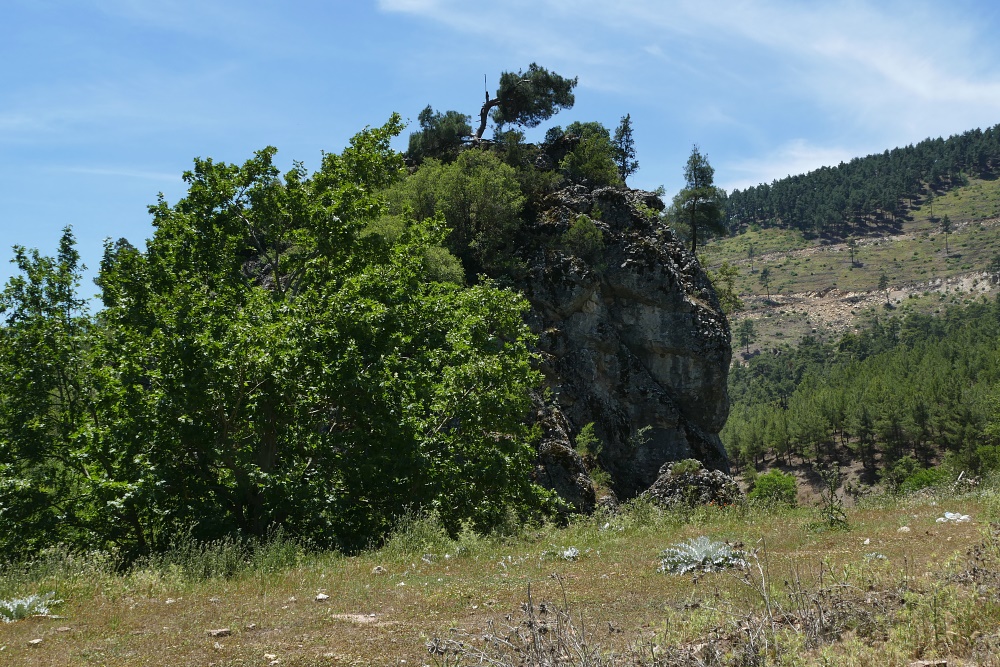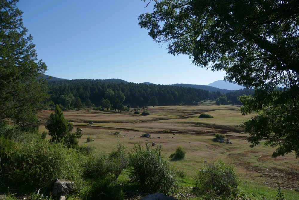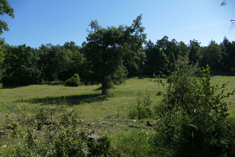 Immer wieder tauchen im Wald solche kleine oder größere, bewirtschaftete Wiesen auf. Hier ist zum ersten Mal mein heutiges Ziel, das in der Ebene liegende Yukari Gökdere zu sehen.