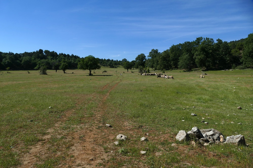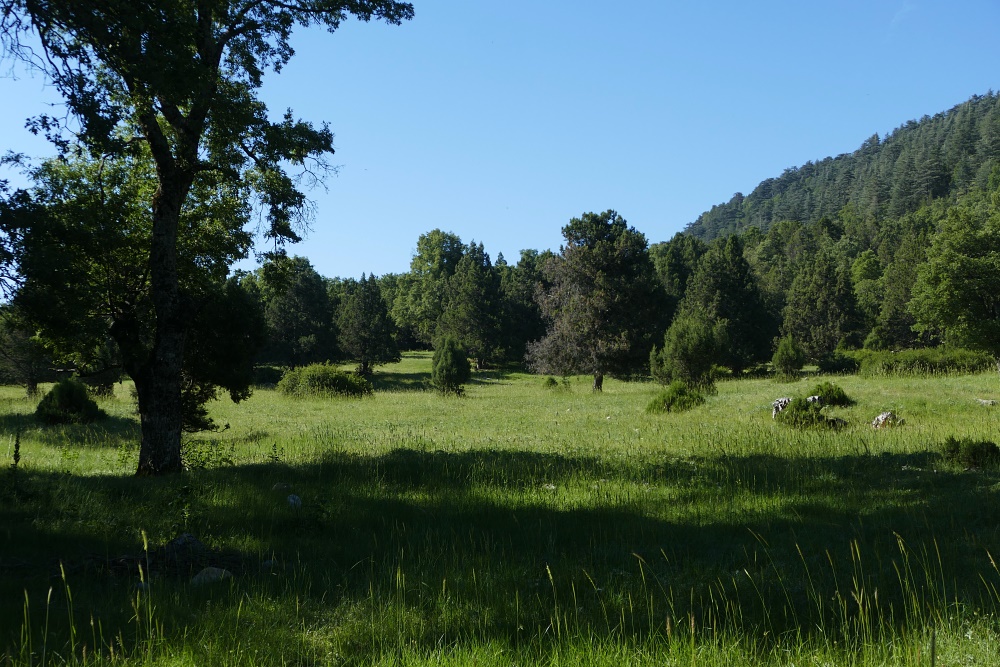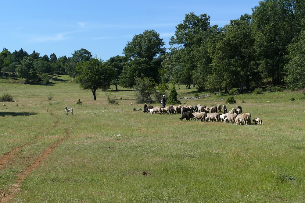Auf dieser Lichtung ist auch eine Herde Schafe mit einem Kangal als Hütehund unterwegs.