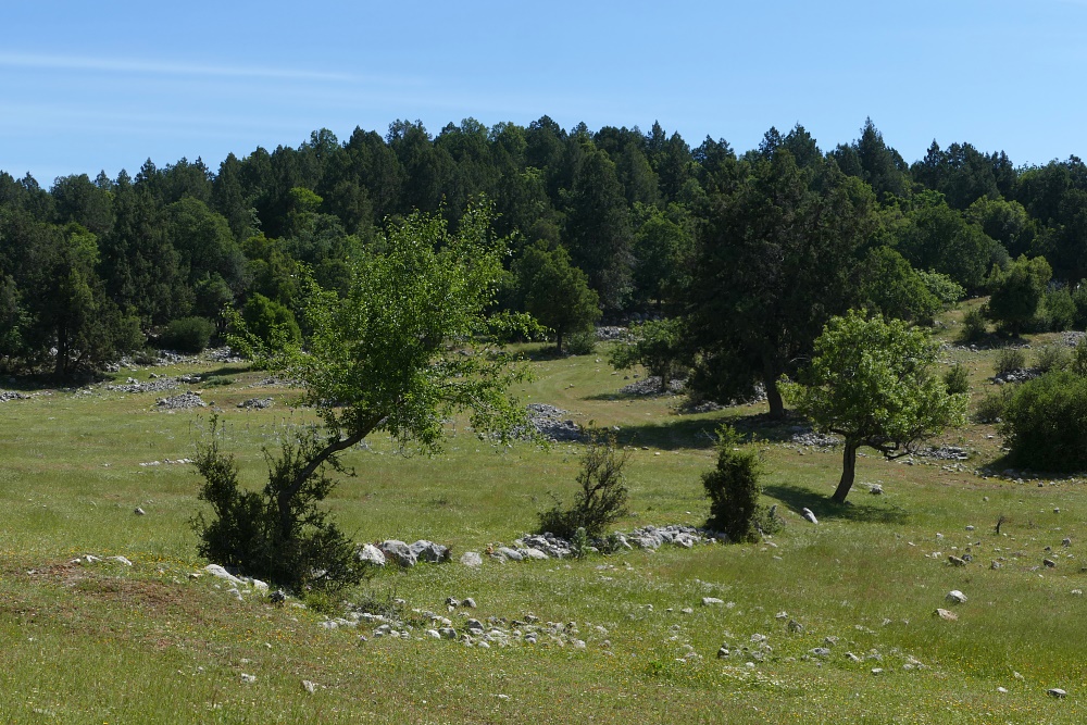 Die Wiese geht am Randein ein felsübersätes Gelände über.