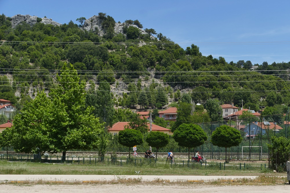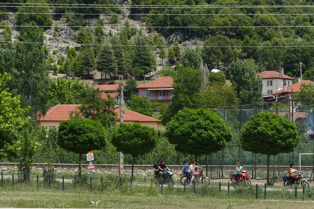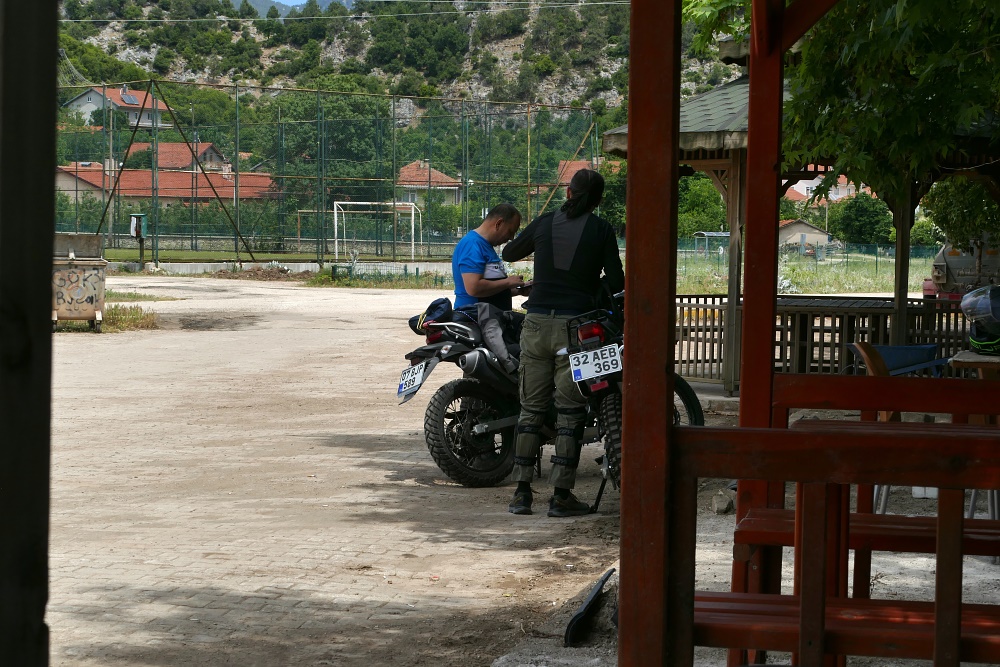 Zunächst hole ich mir im Dorfladen kühle Getränke und mache eine Stunde Mittagspause. Währenddessen machen es sich auch zwei Motorradfahrer unter dem schützenden Blätterdach gemütlich. Nach einiger Zeit komme ich mit ihnen ins Gespräch. Es sind freundliche Design-Hochschullehrer, die von Isparta aus einen Tagesausflug gemacht haben. Einer davon ist schon viel auf der Welt herumgekommen, auch in Deutschland, und ich kann mich ein bisschen mit ihm auf deutsch und englisch unterhalten.