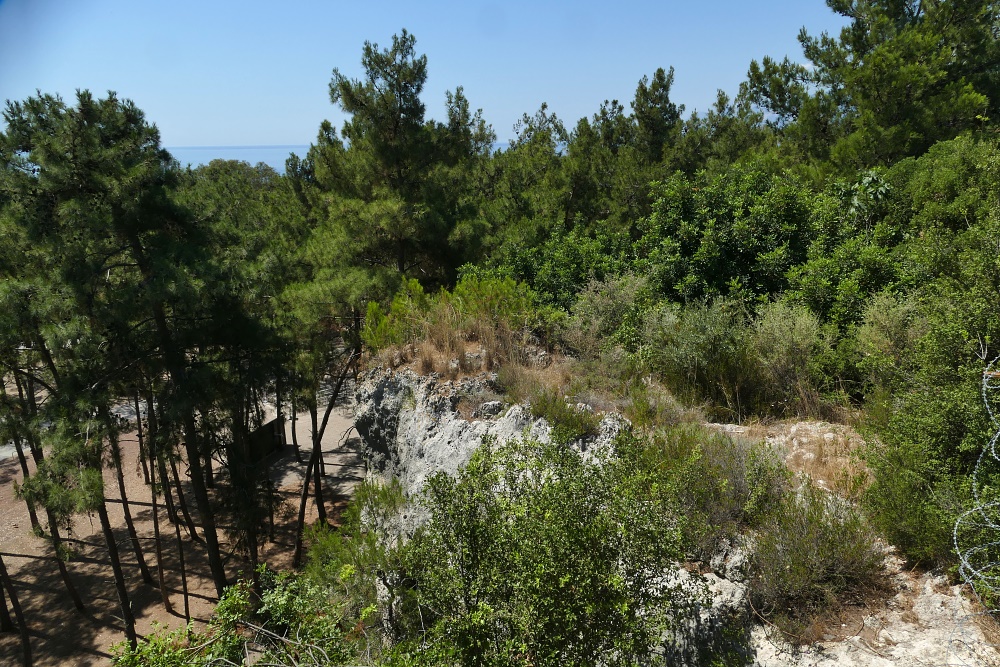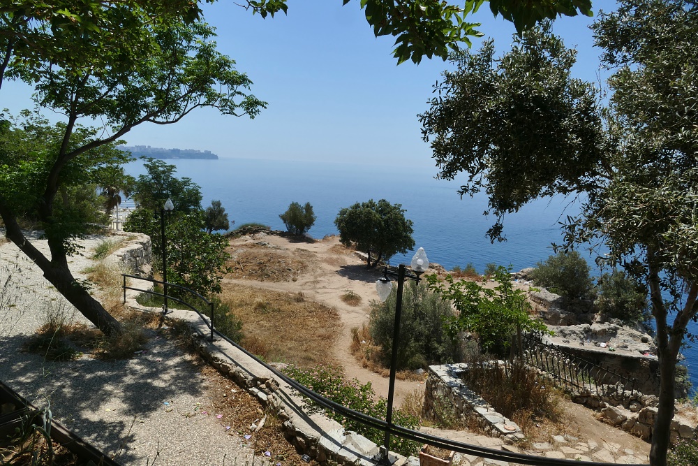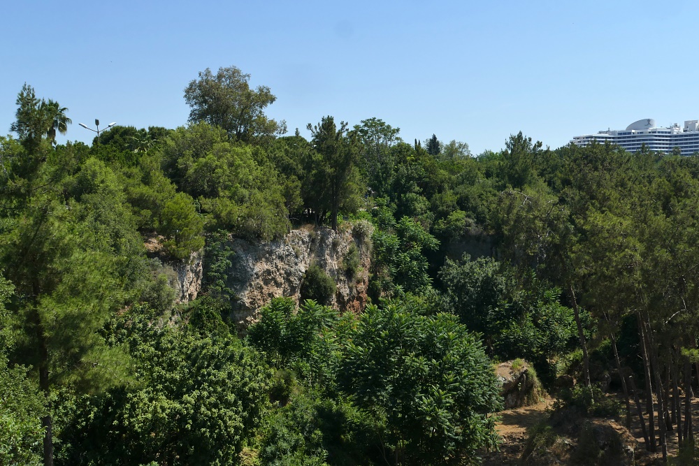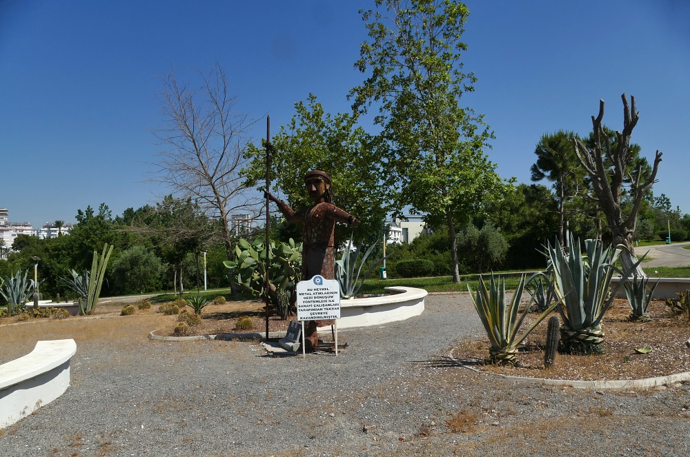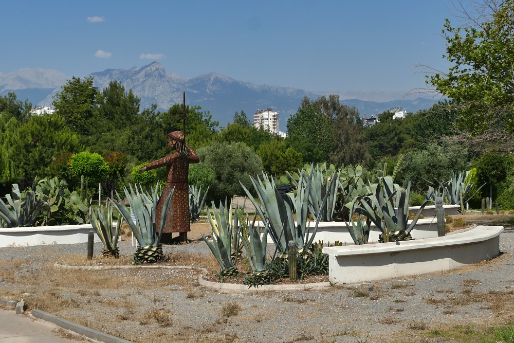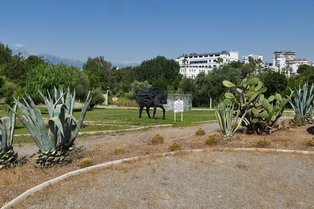 Morgens ist es zwar heiß, aber bei etwas weniger Anstrengung kann man doch noch einiges unternehmen. Ich fahre mit der roten, ehemals Nürnberger Tram bis zur Endhaltestelle am Konyalti-Strand und mache mich dann auf zum Atatürk-Kultur-Park oberhalb des Konyalti-Strandes. Doch zuvor ist ein kleiner Umweg am Corendum-Stadium vorbei fällig. Dadurch gelange ich in den Park am Antalya Aquarium.