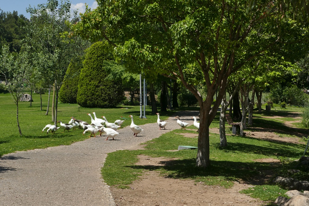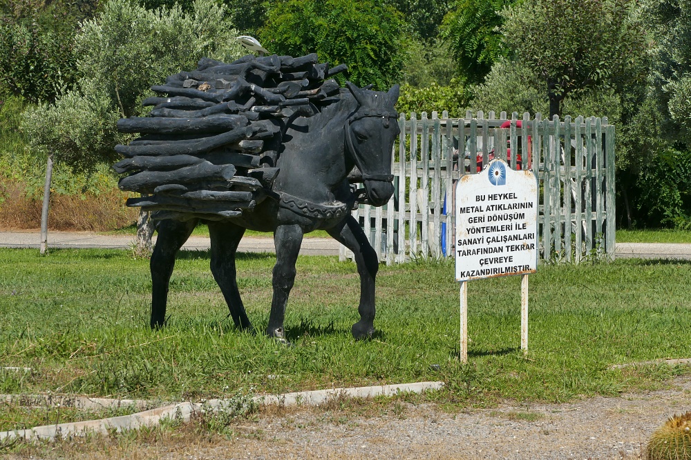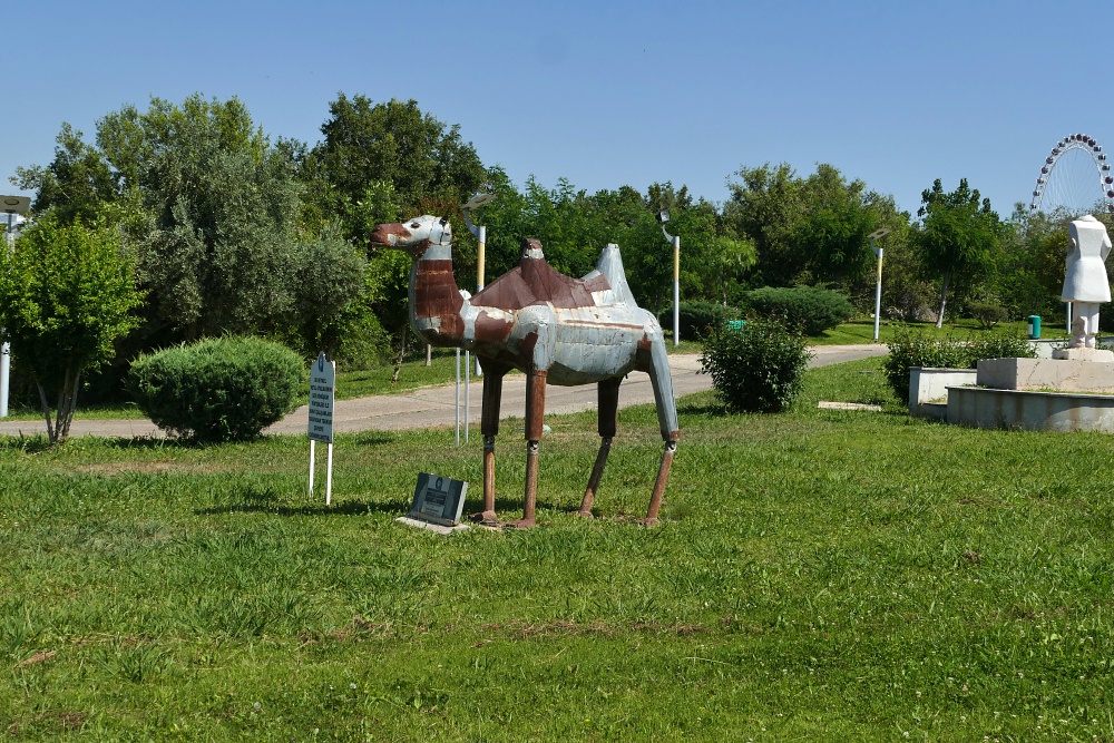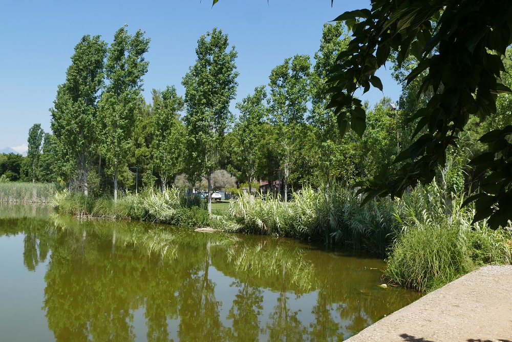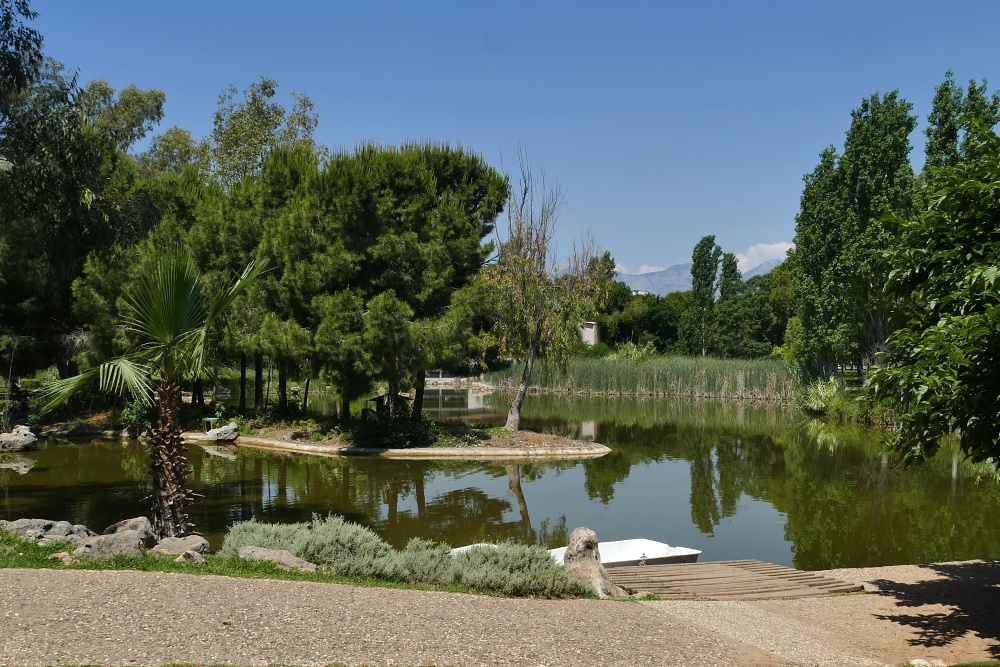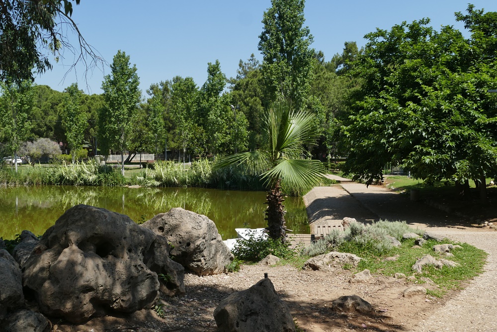 Morgens ist es zwar heiß, aber bei etwas weniger Anstrengung kann man doch noch einiges unternehmen. Ich fahre mit der roten, ehemals Nürnberger Tram bis zur Endhaltestelle am Konyalti-Strand und mache mich dann auf zum Atatürk-Kultur-Park oberhalb des Konyalti-Strandes. Doch zuvor ist ein kleiner Umweg am Corendum-Stadium vorbei fällig. Dadurch gelange ich in den Park am Antalya Aquarium.