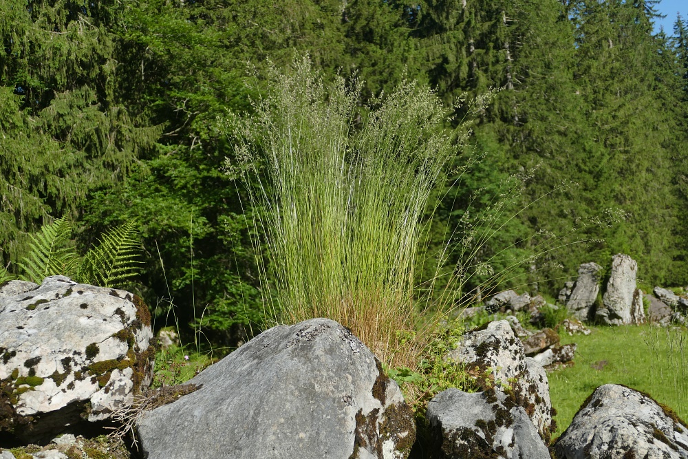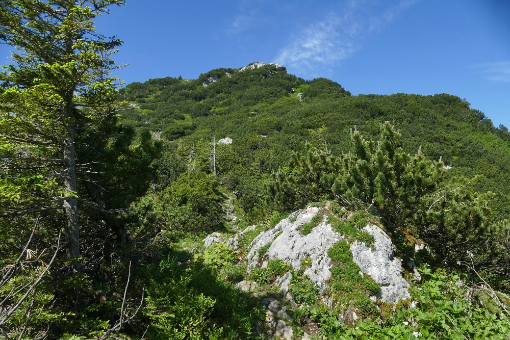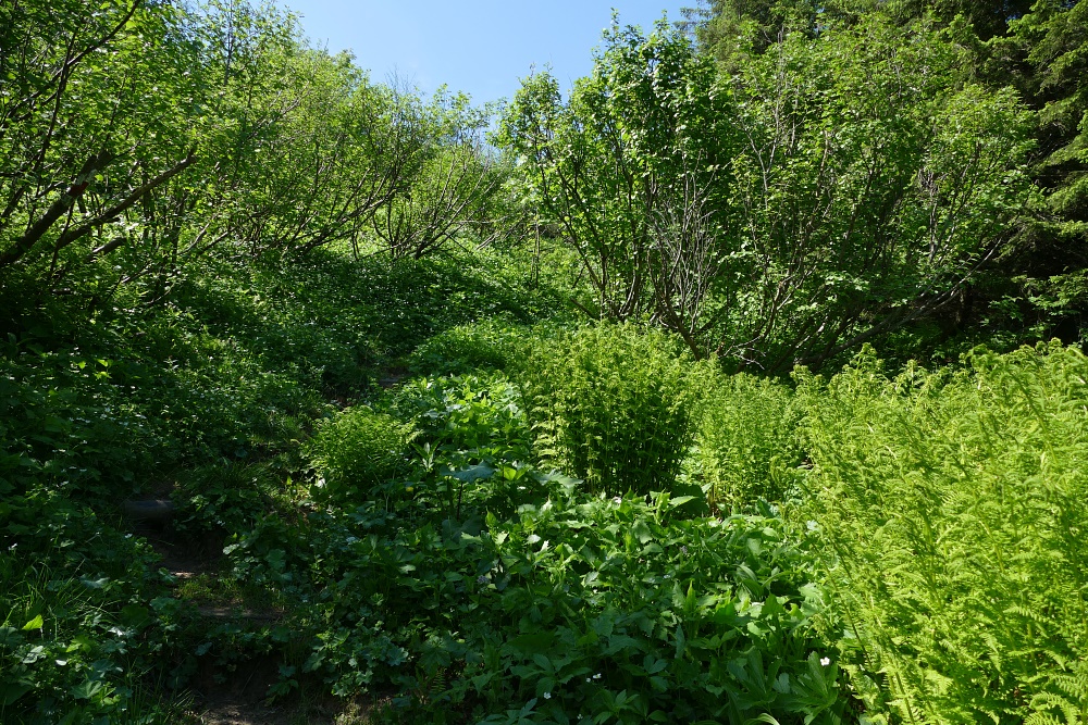 Nach der nur langsam ansteigenden Traverse geht es nun steil hoch zum Windenpass. Die Vegetation in der Nordflanke wird immer dichter.