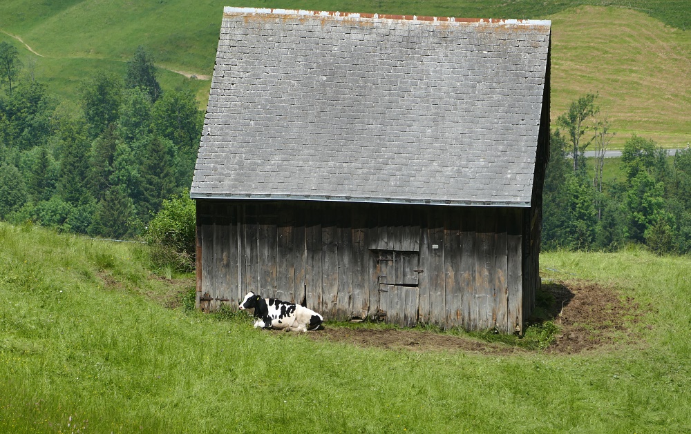 Schwarz-weiß gescheckte Kuh am Stadel genießt die Sonne.