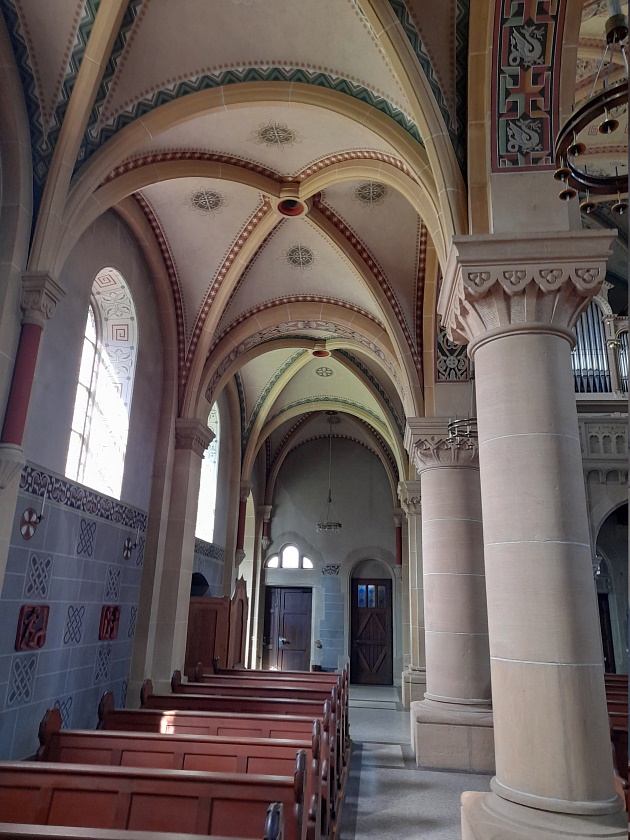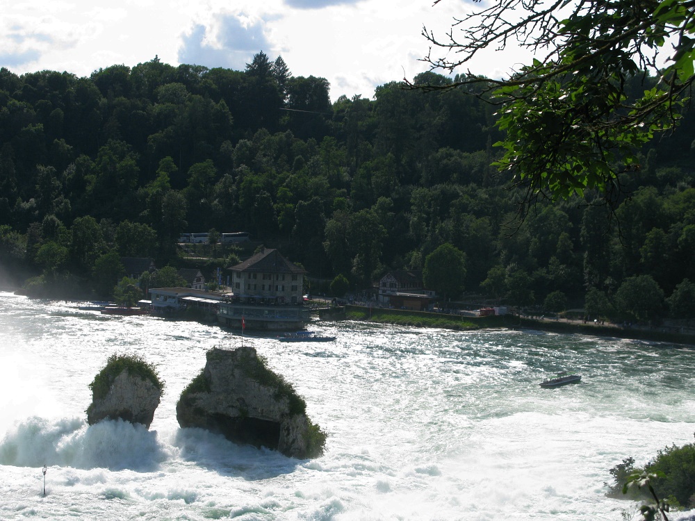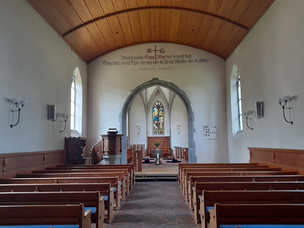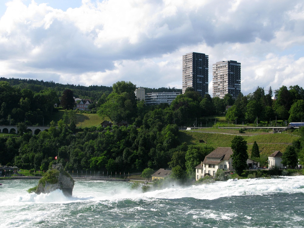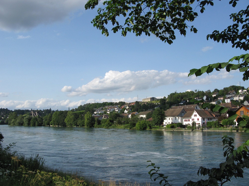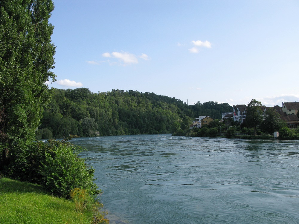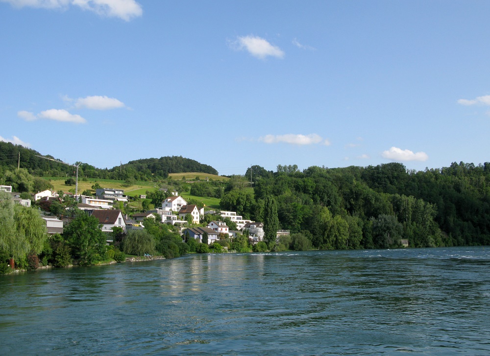 Die evangelische Kirche Laufen am Rhein am anderen Rheinufer, erreichbar von der anderen Rheinseite,wenn man die Eisenbahnbrücke über den Rhein nimmt.