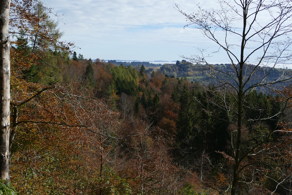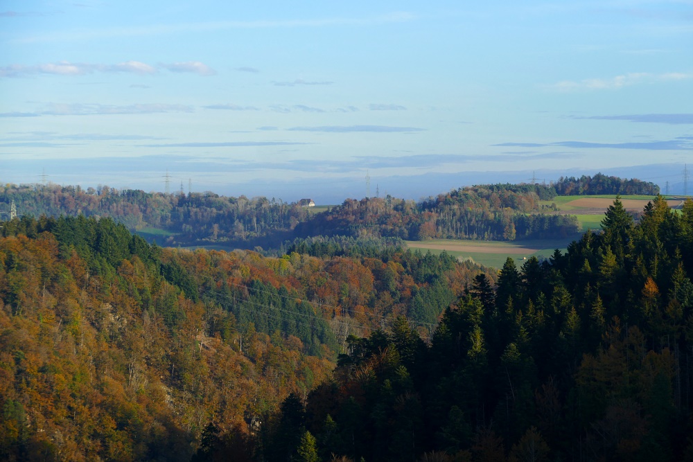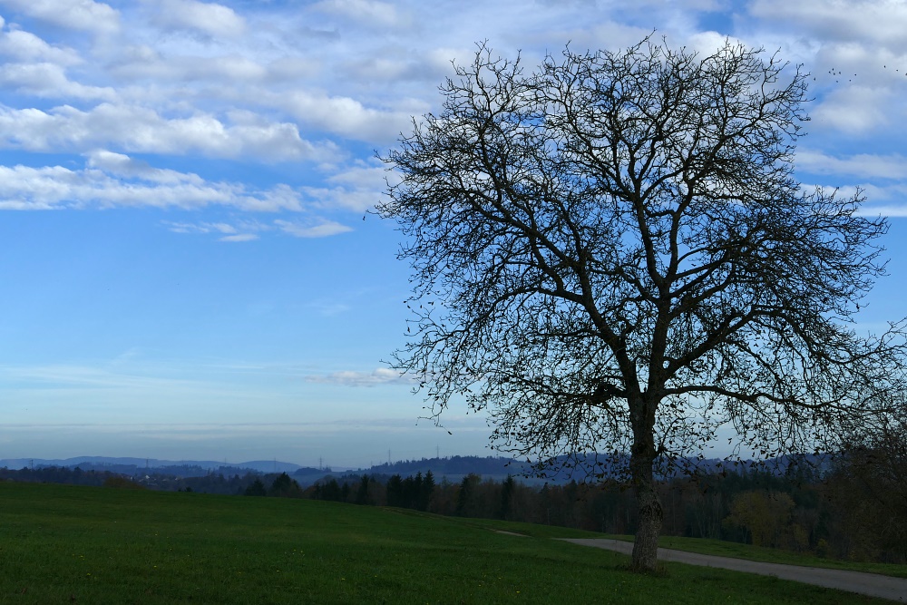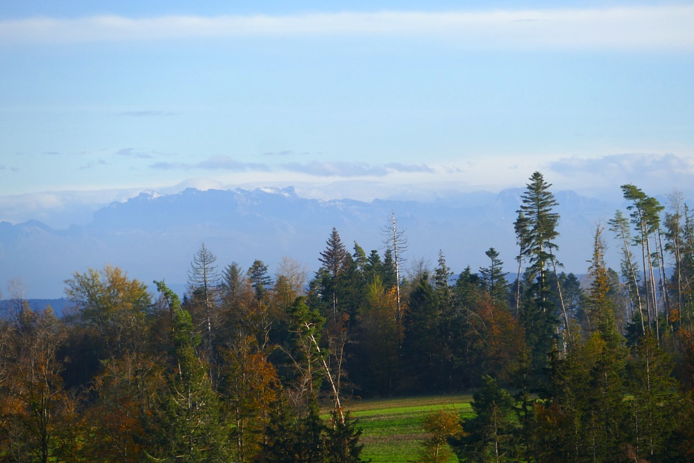 Der Weg führt nun höher Richtung Nöggenschwiel. Vom Hügel aus sind auch die Alpen (Glärnisch) zu sehen.