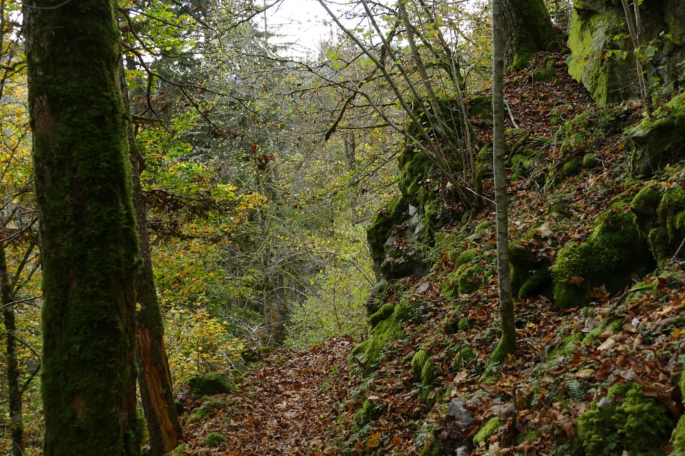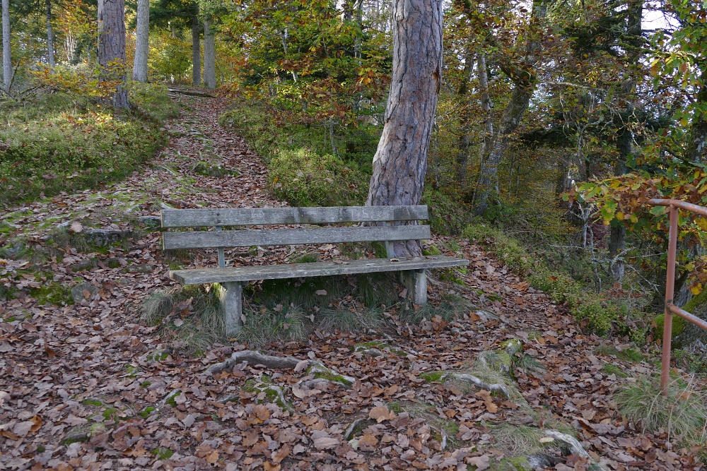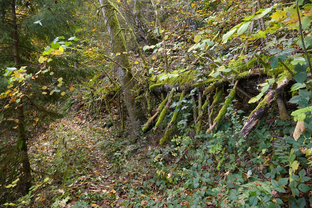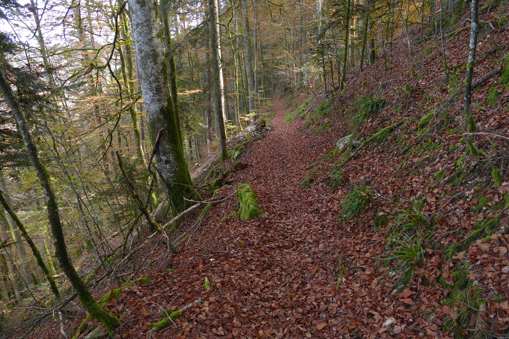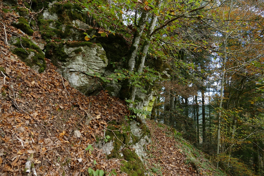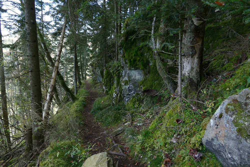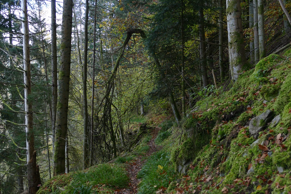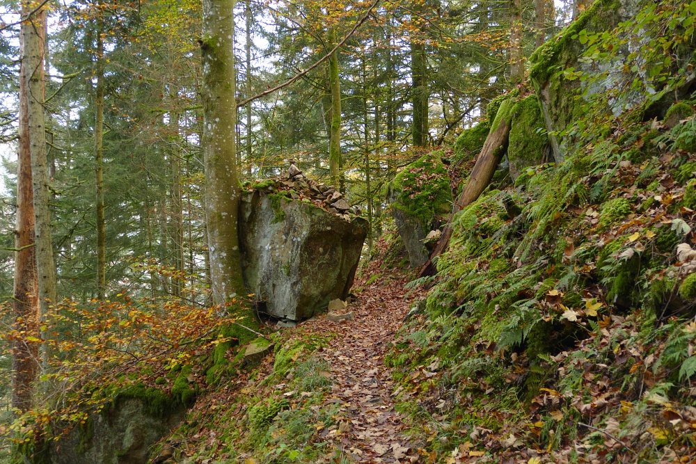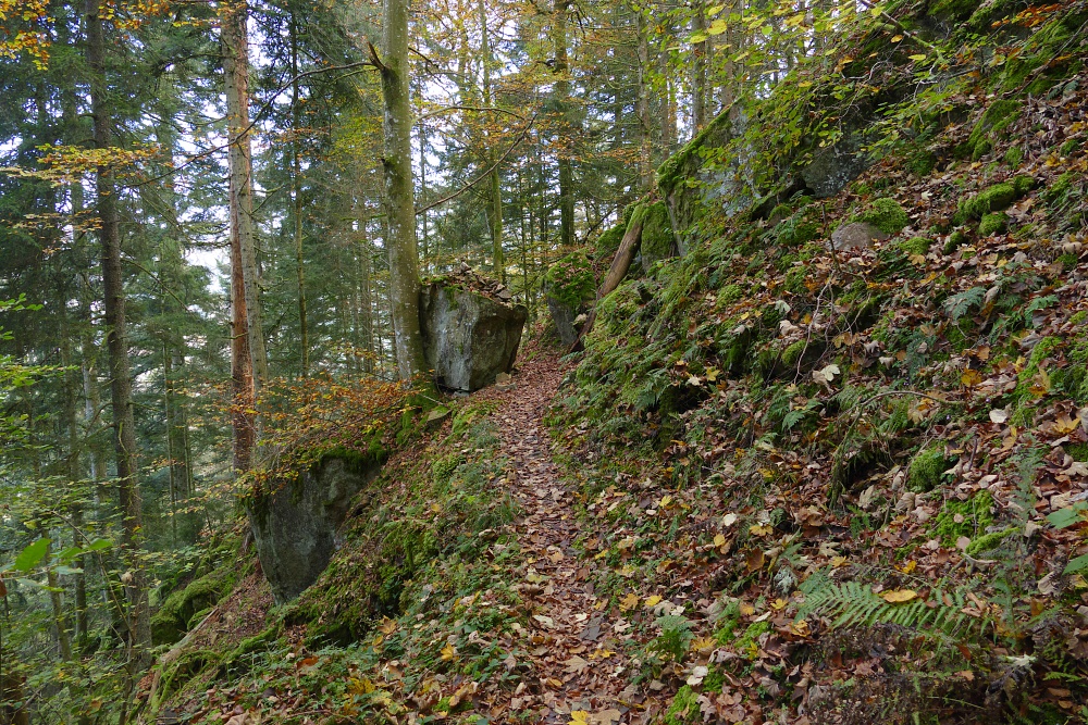 Der Rosenweg verlässt nun den im Hang entlang verlaufenden Wanderweg, um in Serpentinen steil zum Wanderweg zum Hohfluhfelsen aufzusteigen.