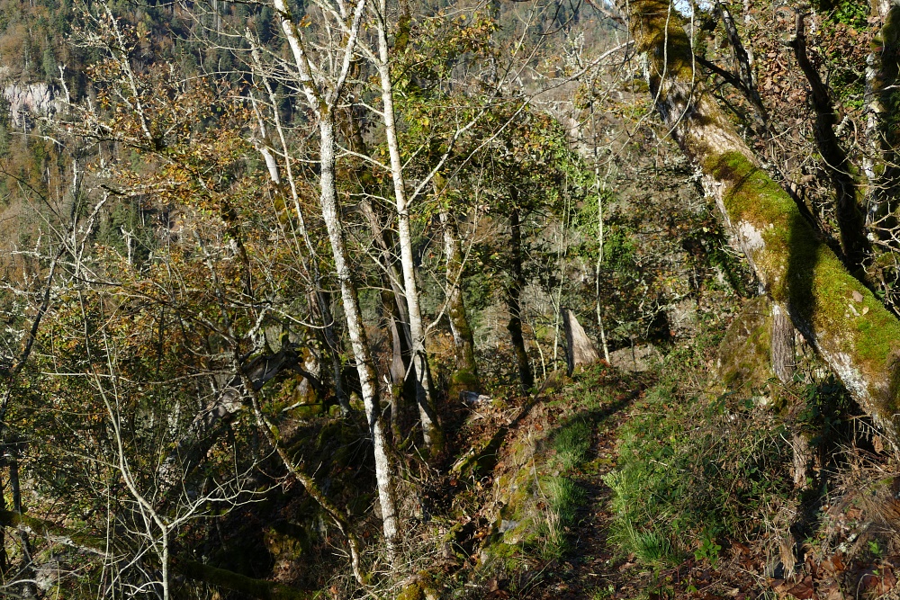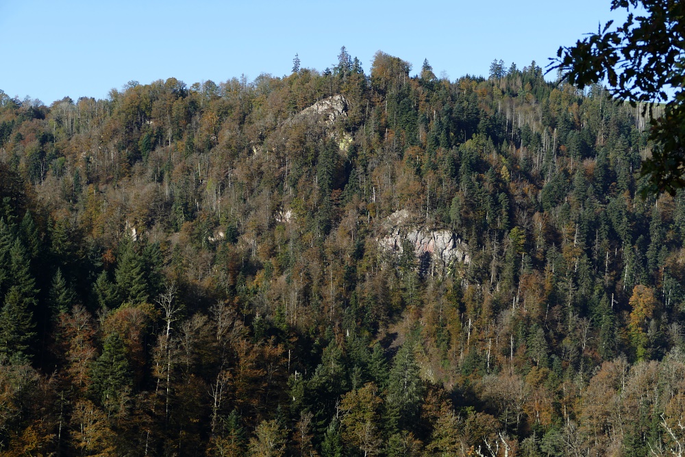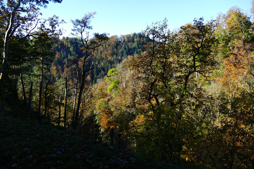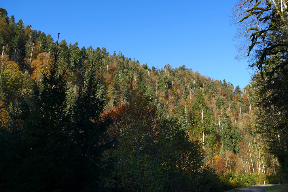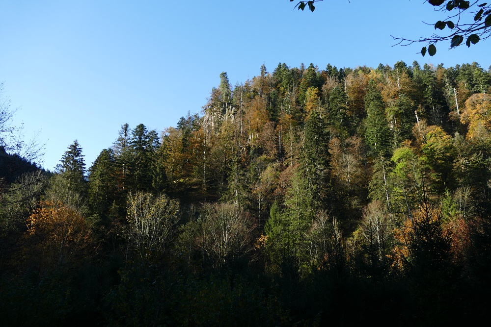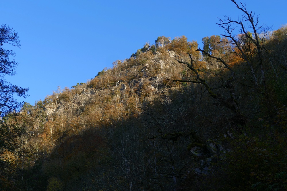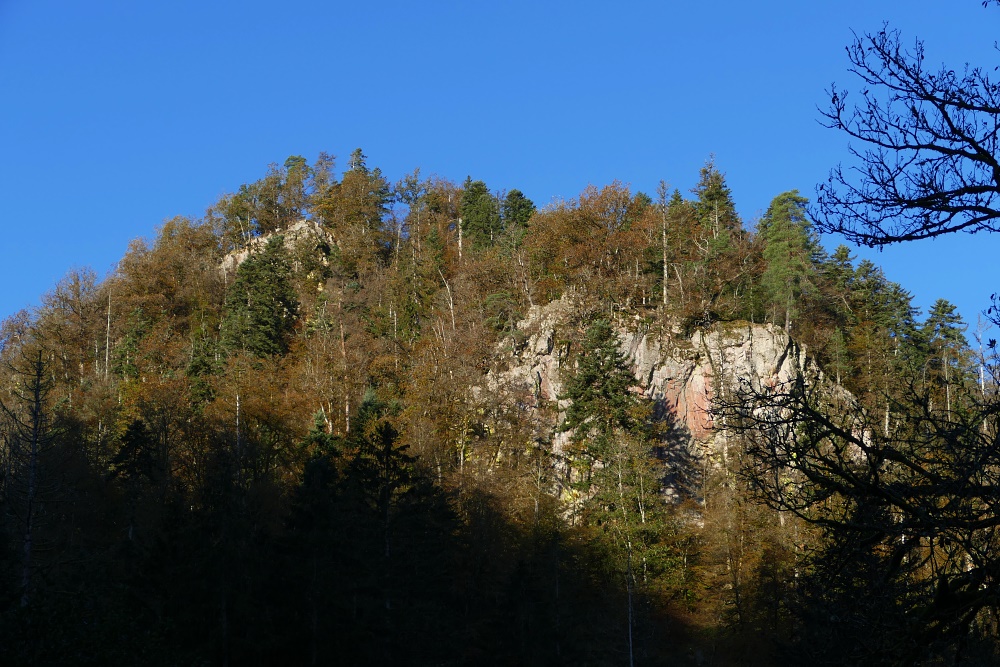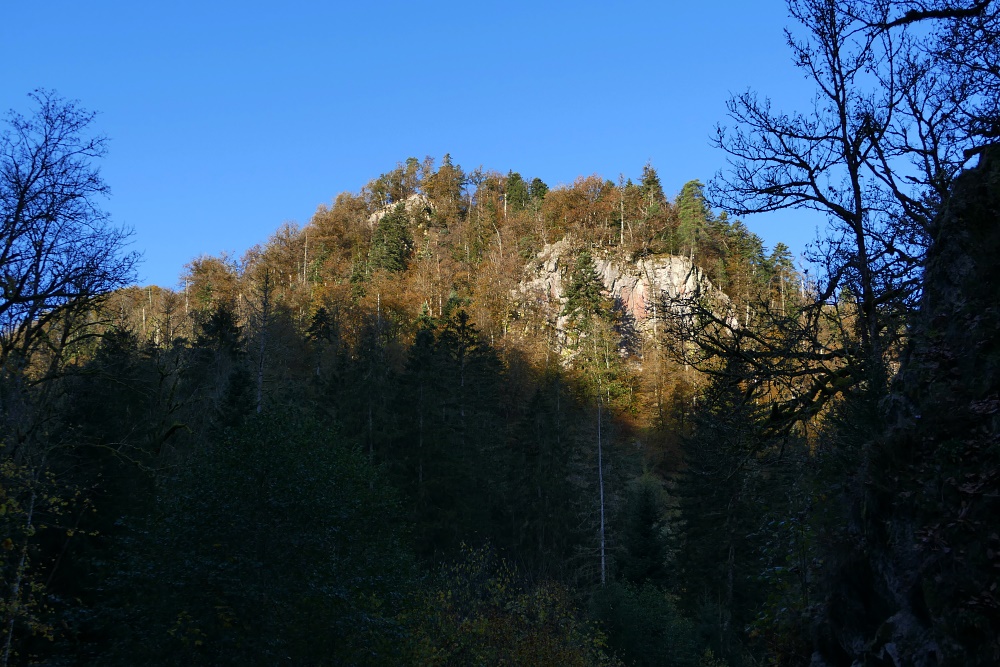 Staunend stehe ich vor den steilen Wänden über dem Schwarza-Tal. Das sind die gleichen Wände, die gestern vor Sonnenuntergang vom Hohfluhfelsen aus zu bewundern waren. Der weitere Plan ist nun, etwas auf der Straße talaufwärts zu laufen, danach auf den Hutpfad einzuschwenken, der dann etwa auf halber Höhe durch den Hang verläuft.