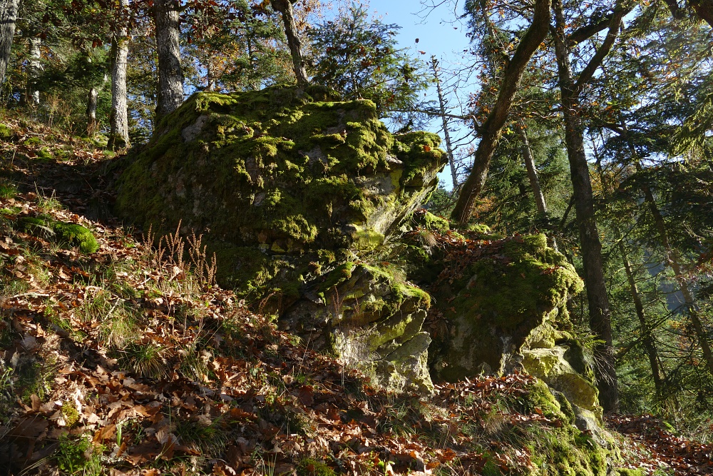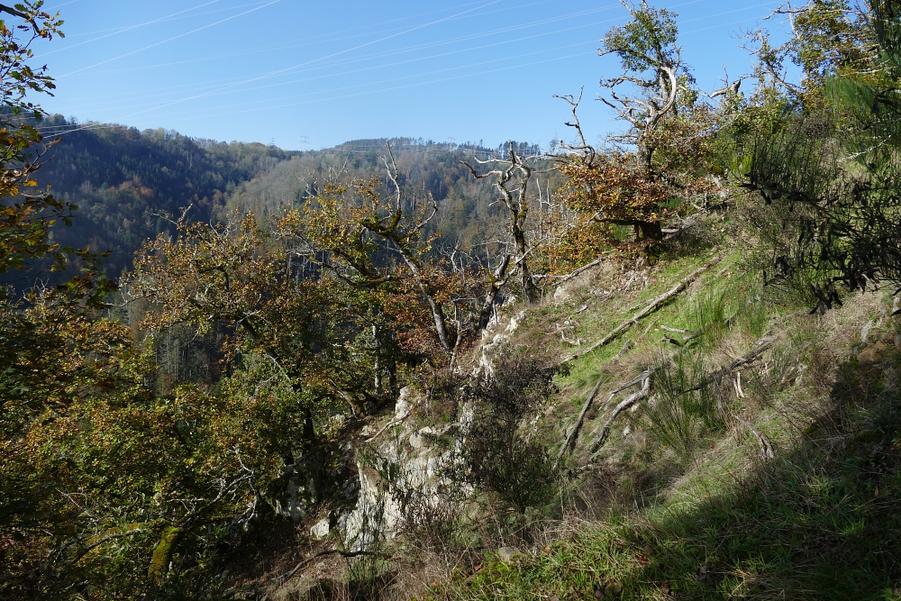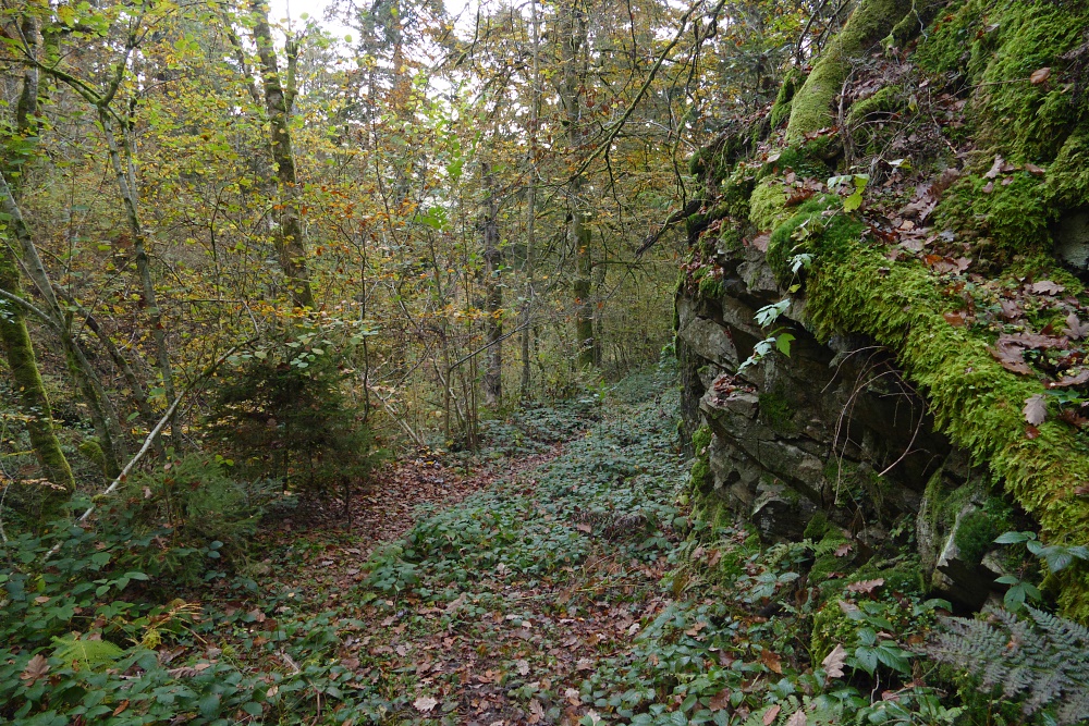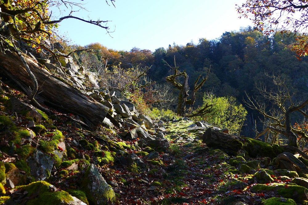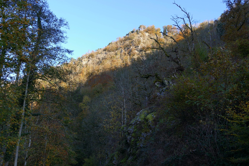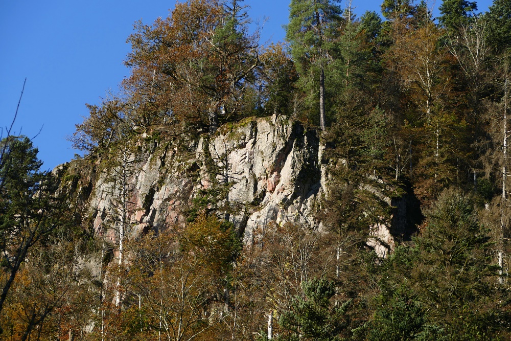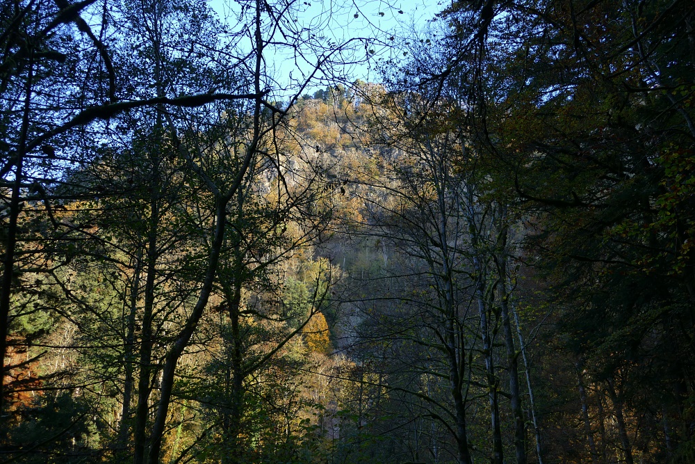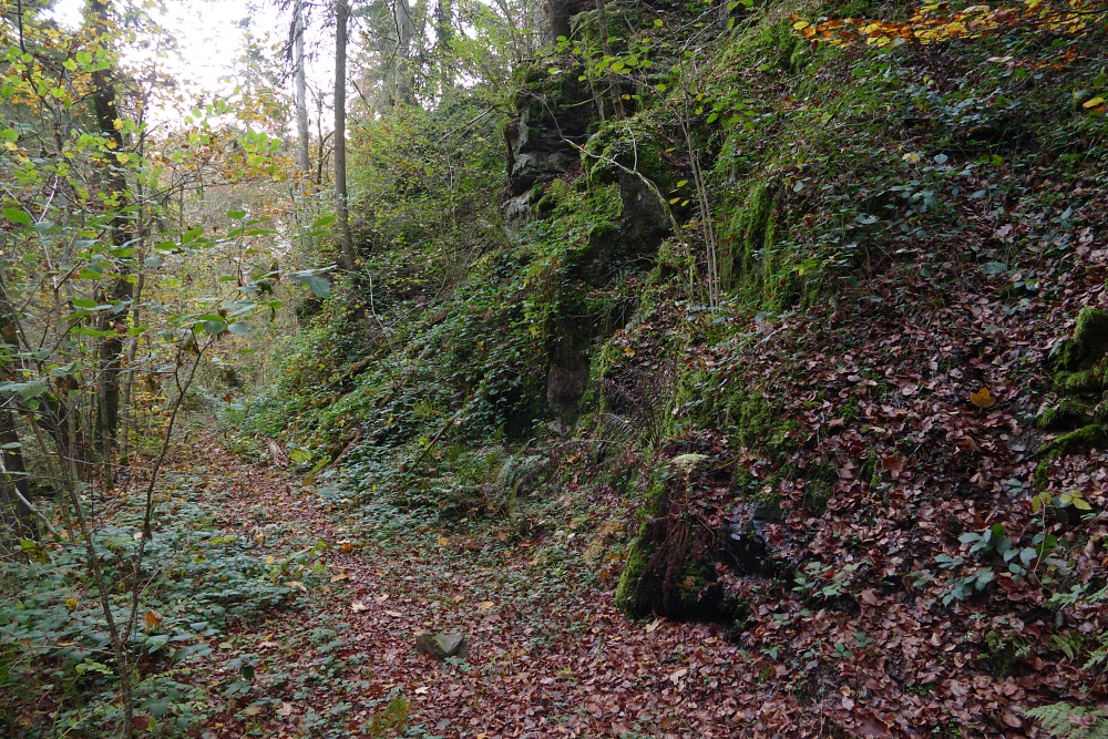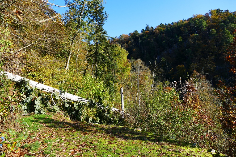 Staunend stehe ich vor den steilen Wänden über dem Schwarza-Tal. Das sind die gleichen Wände, die gestern vor Sonnenuntergang vom Hohfluhfelsen aus zu bewundern waren. Der weitere Plan ist nun, etwas auf der Straße talaufwärts zu laufen, danach auf den Hutpfad einzuschwenken, der dann etwa auf halber Höhe durch den Hang verläuft.