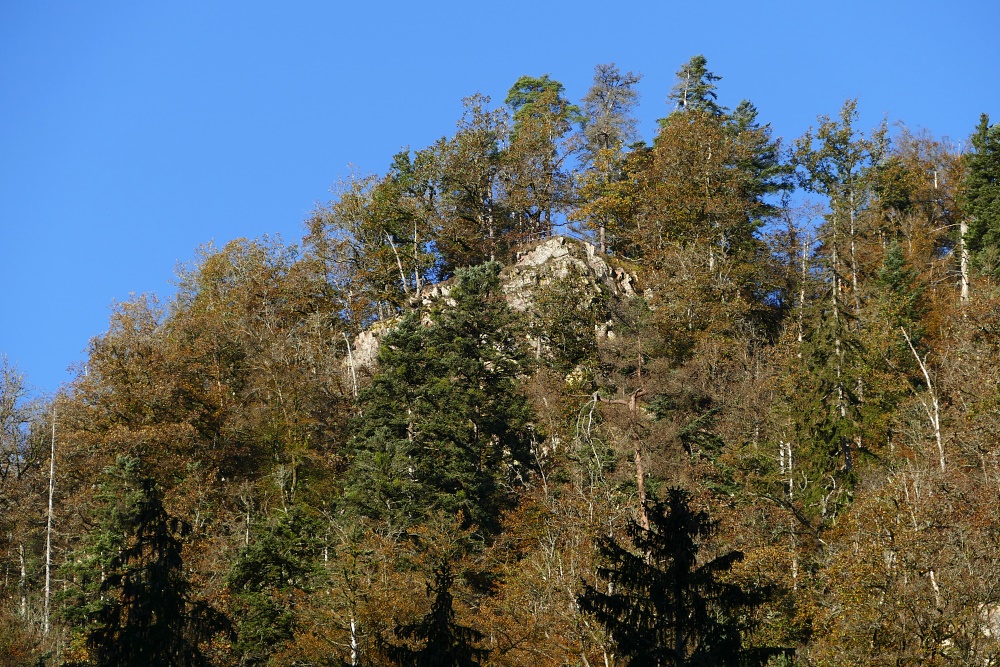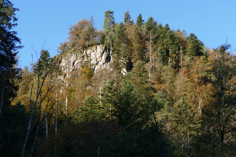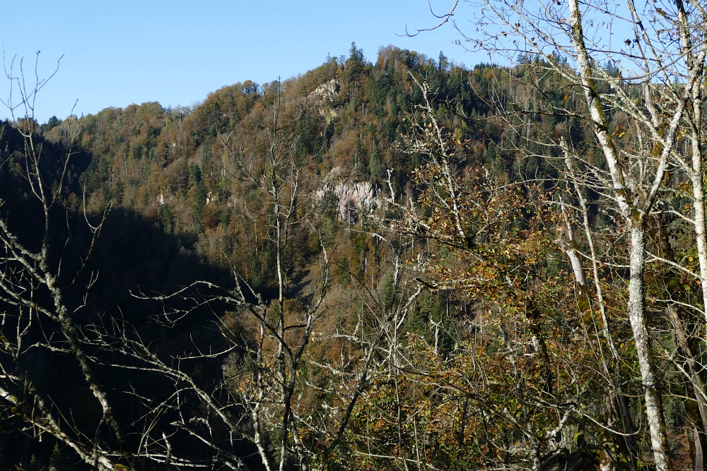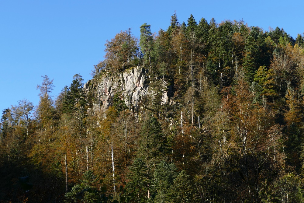 Nachdem ich auf der Schwarzatalstraße um die Ecke gebogen bin, habe ich freie Sicht zurück zum Hohfluhfelsen
