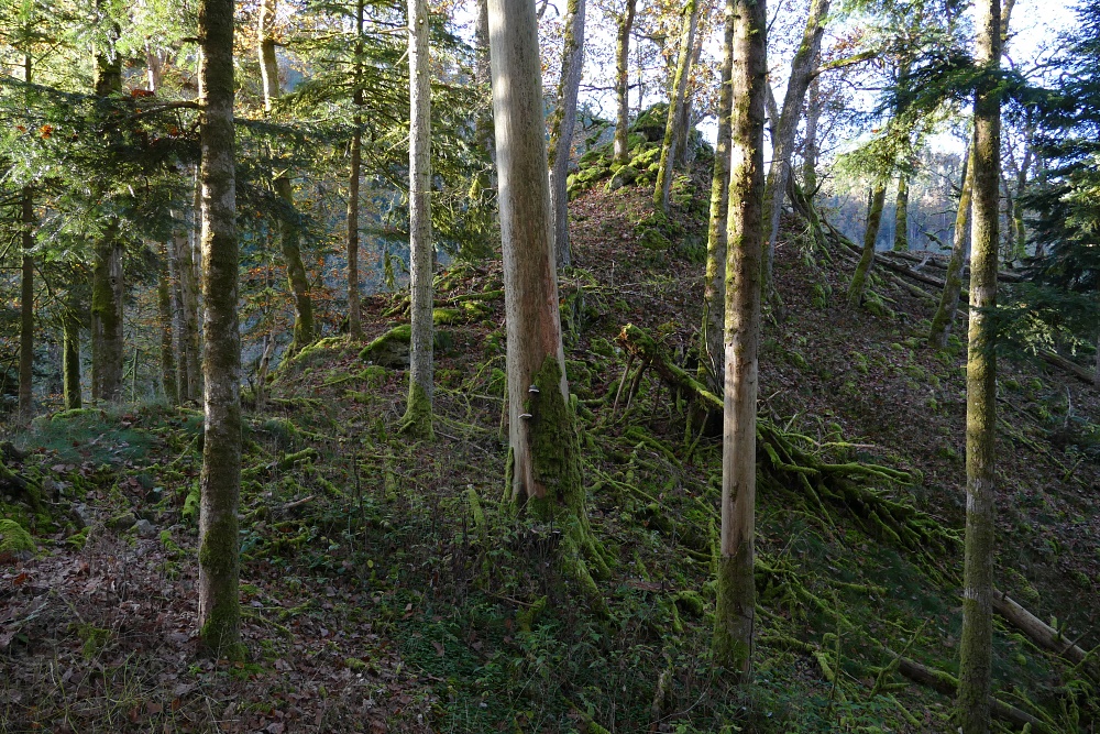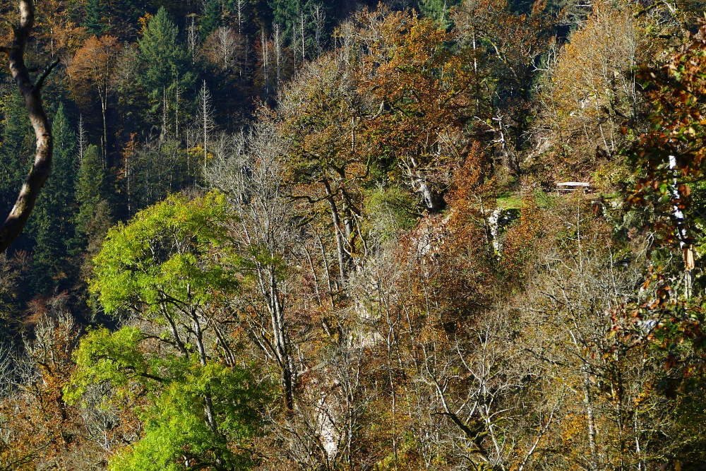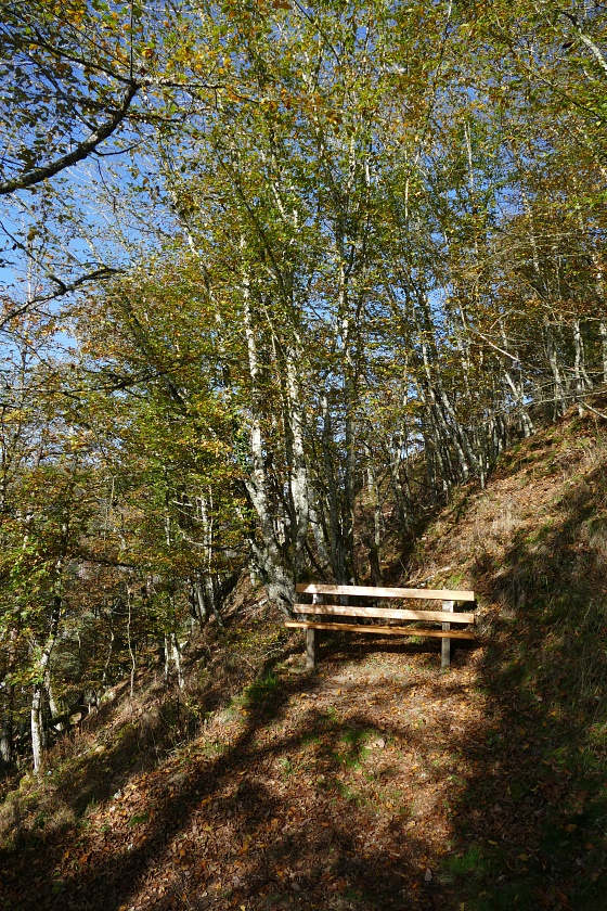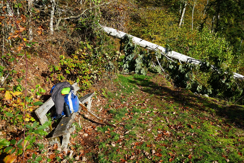 Nach längerer Zeit in mehr oder weniger dichtem Wald, macht der Hutweg eine scharfe Kurve und geht über in einen Fahrweg. Am Übergang an dieser exponierten Stelle lädt eine Bank und die Aussicht zum Verweilen ein.