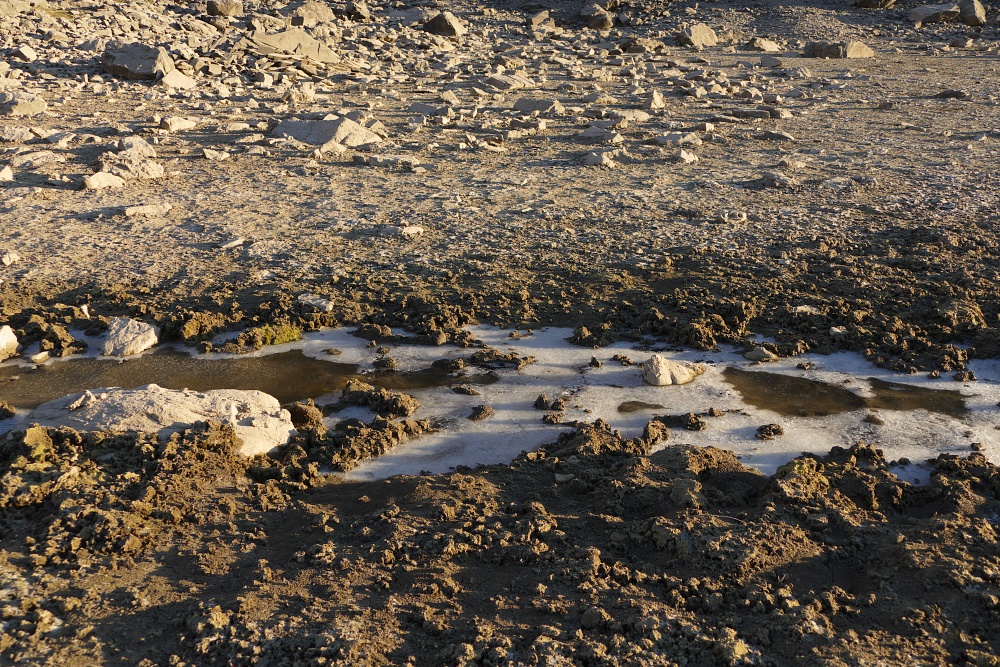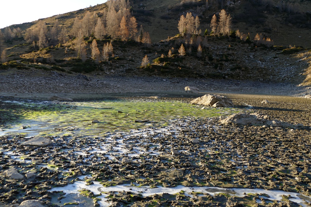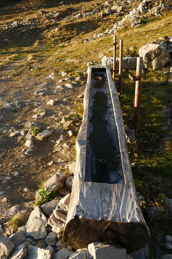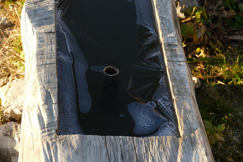 An der Alpe Obersäss. Nachts war es sternenklar, was auch erklärt, dass der Brunnen, der gestern noch eisfrei war, über Nacht eine undurchdringliche, mehrere Zentimeter dicke Eisschicht gebildet hat.