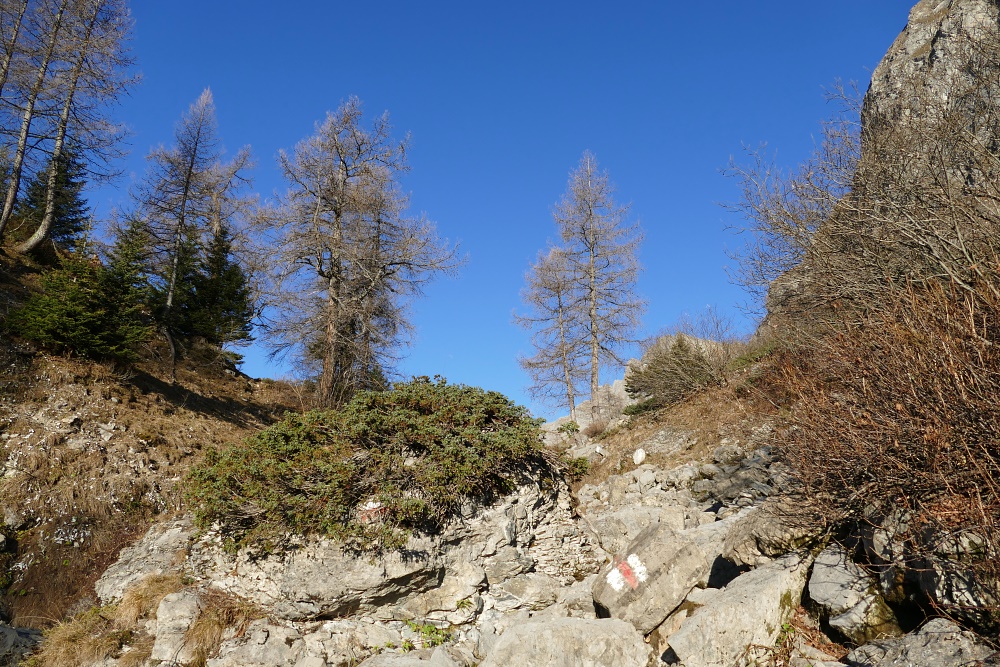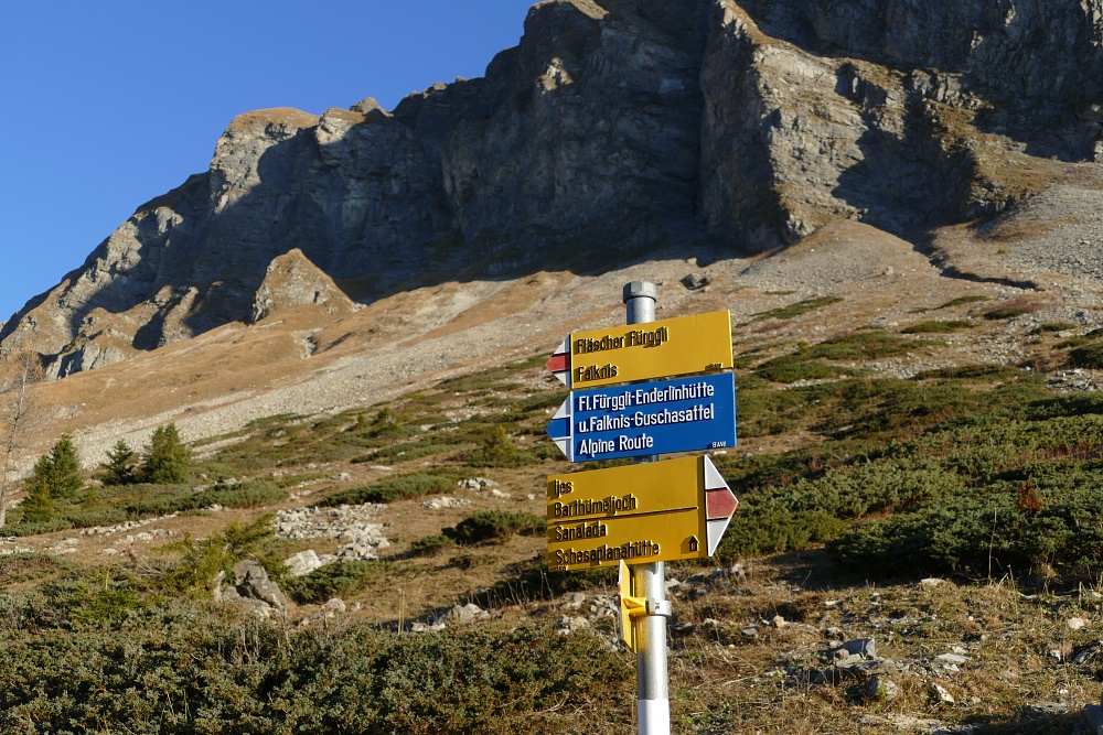 Ich bin wieder zurück bei der Verzweigung am Unteren See. Eigentlich wollte ich noch einen Tag weiter Richtung Schesaplanahütte wandern. Doch angesichts der eisigkalten und langen Nacht ändere ich meinen Plan. Lediglich einen näheren Blick auf die Route möchte ich noch werfen und danach schnurstracks zurück zu Seilbahn und weiter nach Hause ins wohlig Warme gehen.