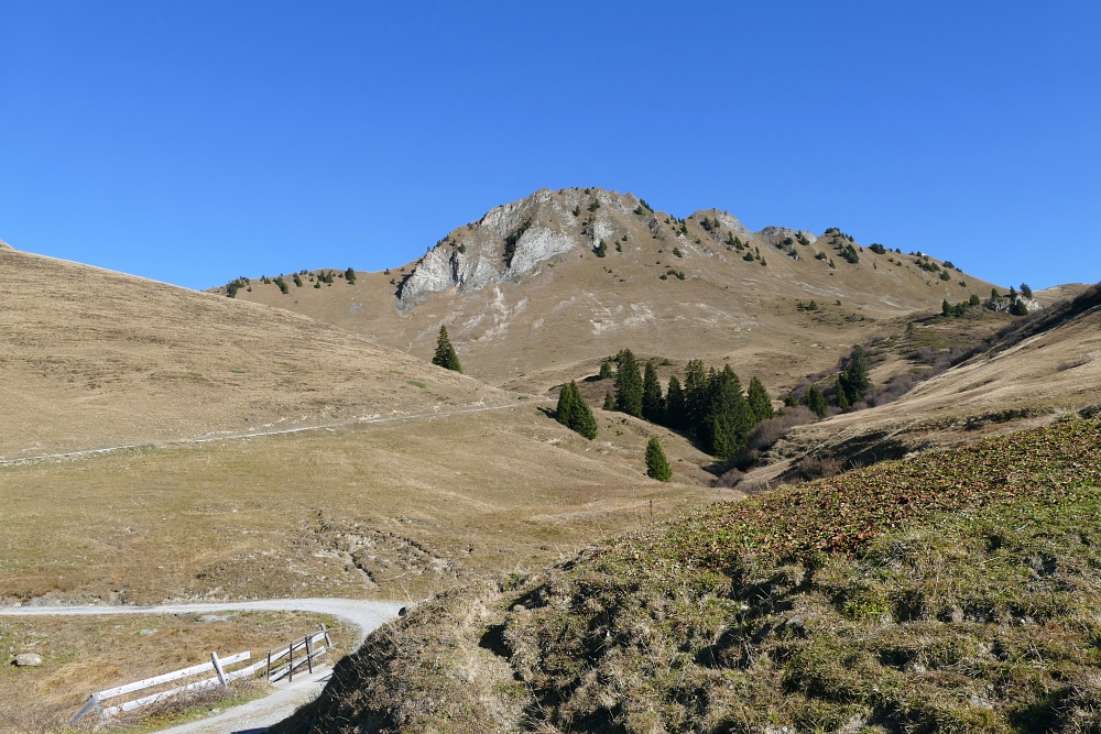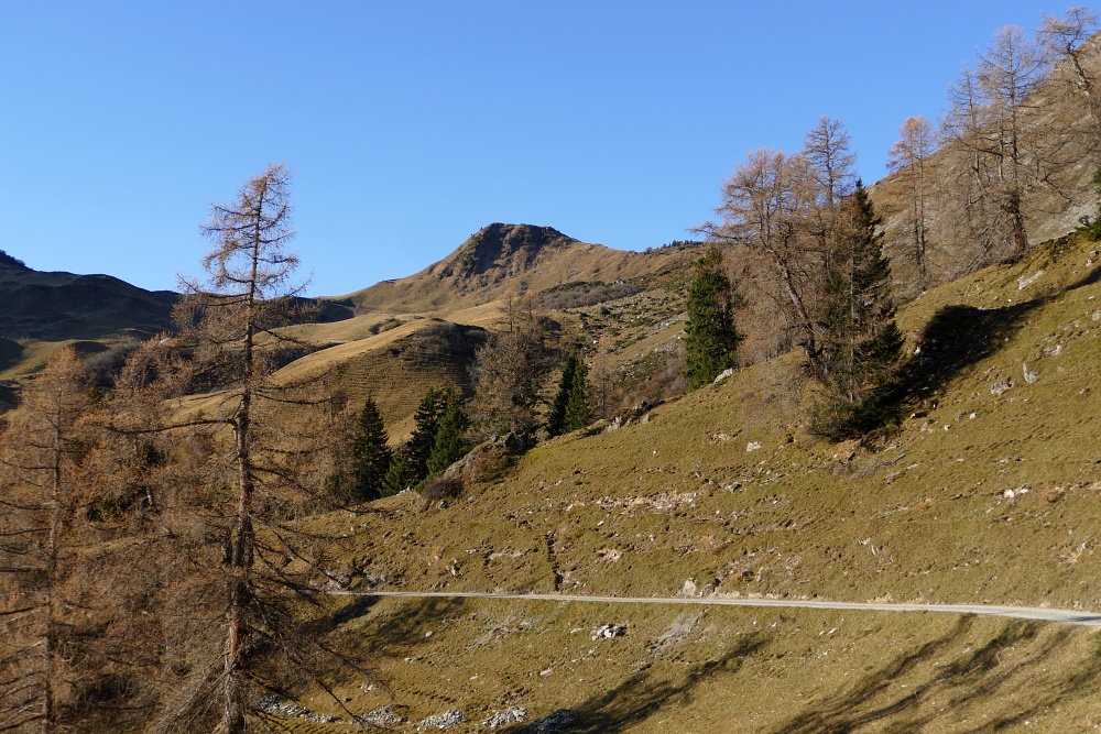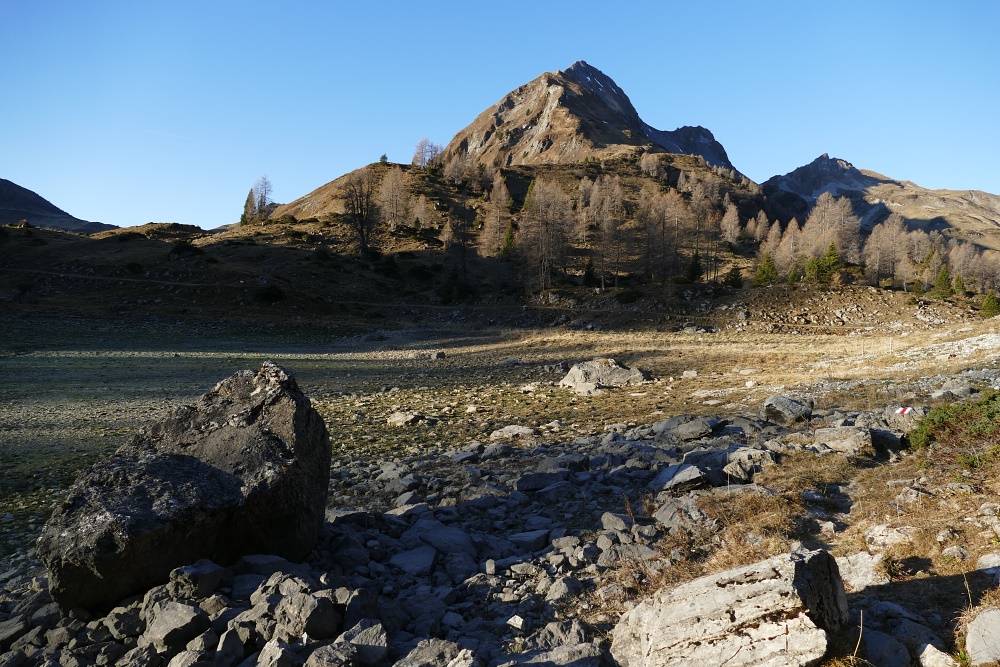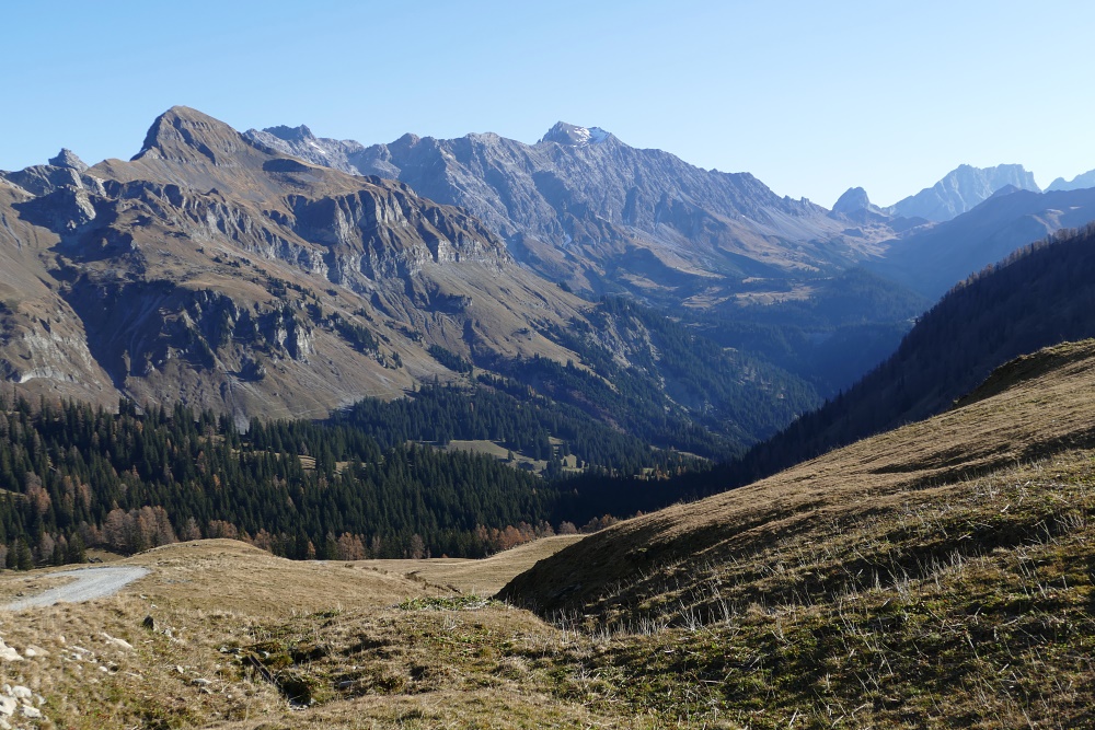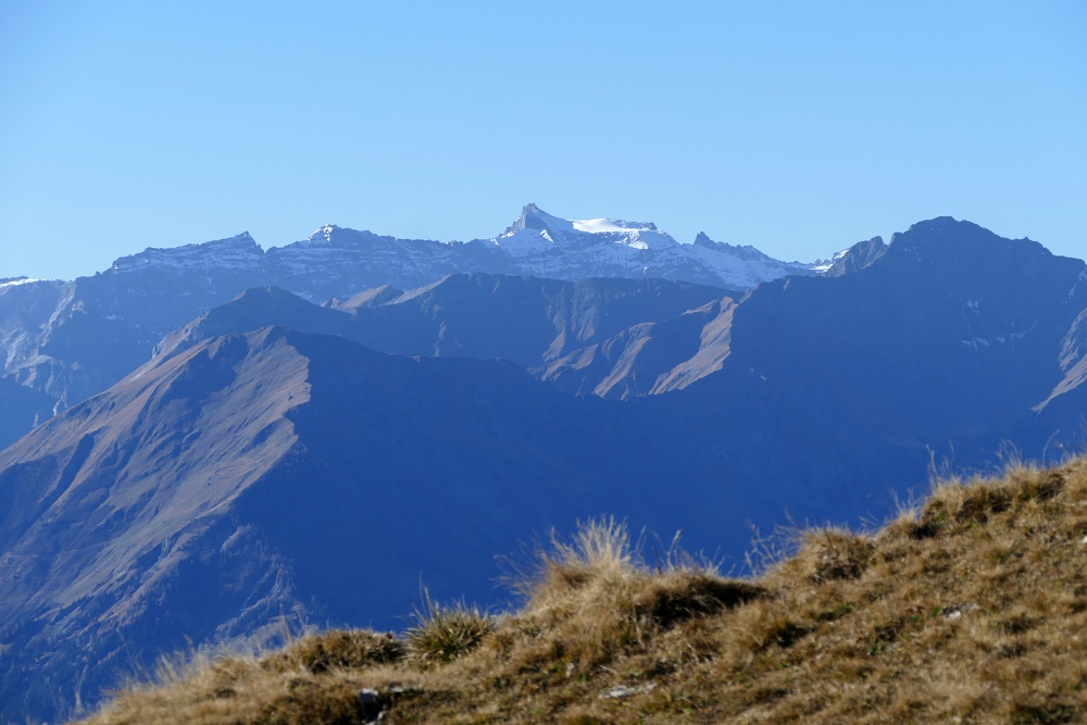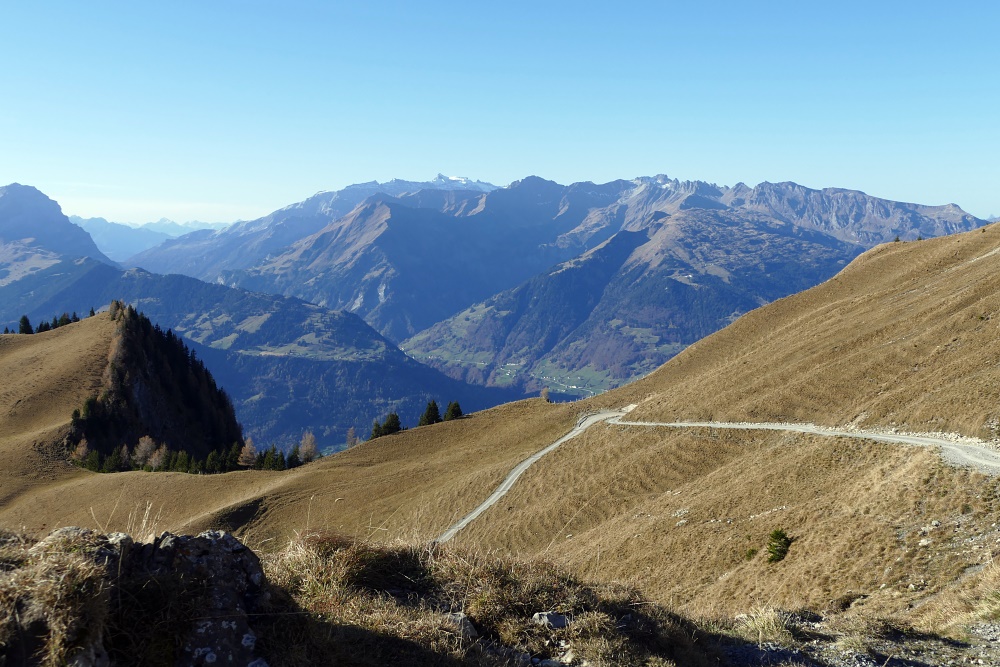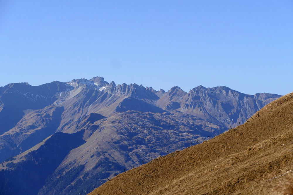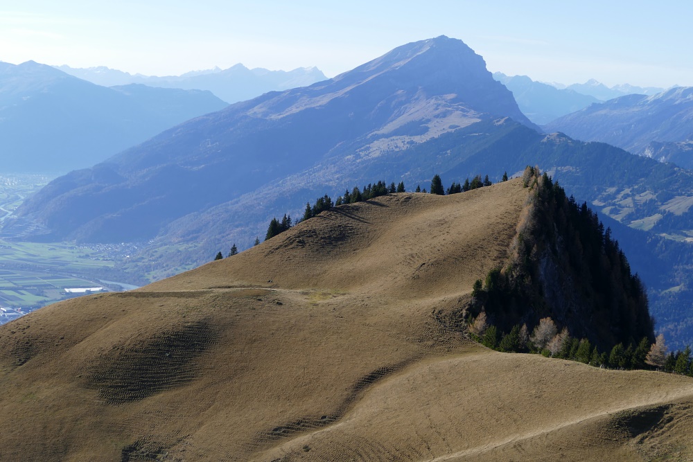 Das Fläscher Tal liegt nun hinter mir. Jetzt dominiert wieder der Blick zu den Bündner Alpen, hier mit dem charakteristischen Ringelspitz.