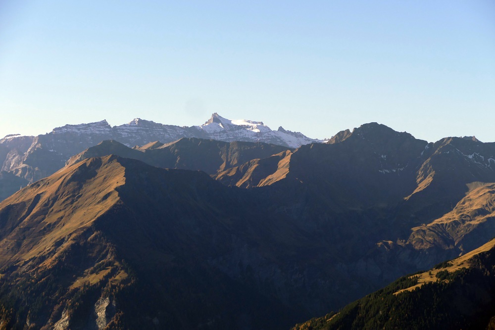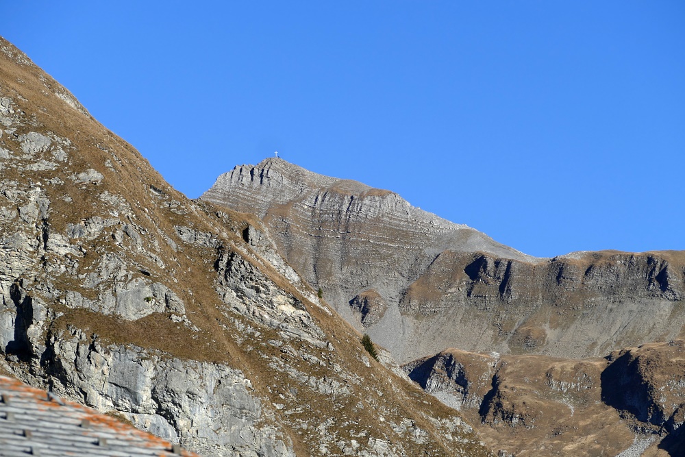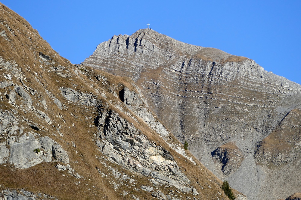 Blick zum Falknis. Das Gipfelkreuz ist jetzt mit bloßem Auge kaum mehr zu erkennen.