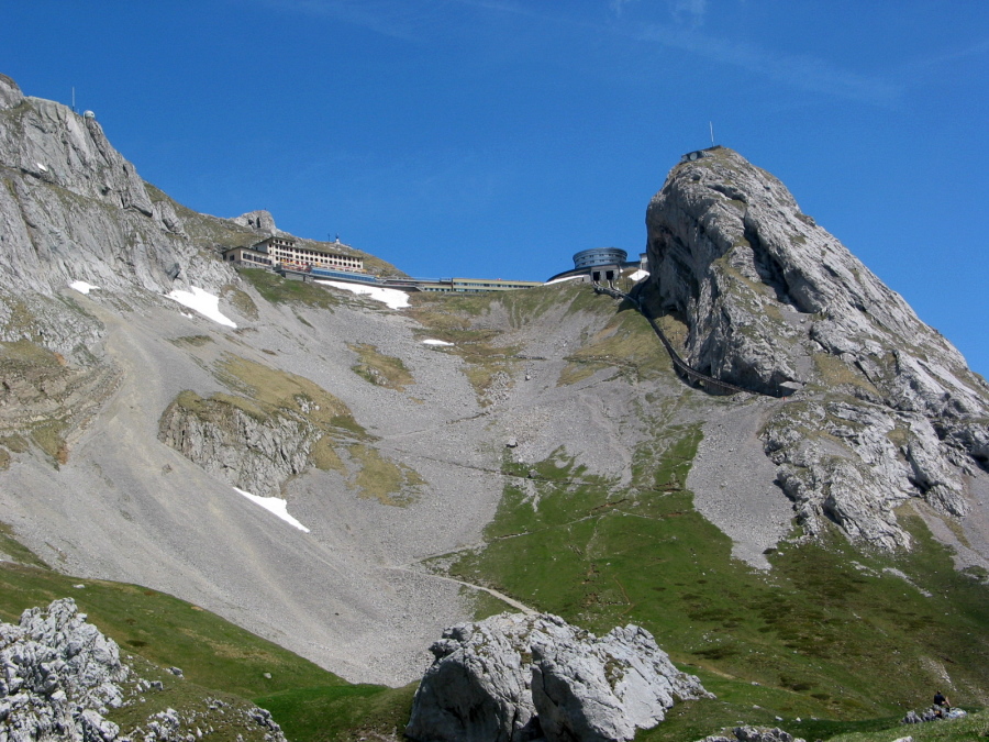 Eine schöne Tour sollte es werden, eine Gewalttour ist es geworden. Denn ohne nach dem langen Winter besonders fit zu sein, lassen wir uns dazu überreden, zum Beginn der Wandersaison den Pilatus von Alpnachstad aus erklimmen zu wollen. Die Ehre gebietet es natürlich, auf die Zahnradbahn zu verzichten, also nehmen wir den Wanderweg, der die 1700 Höhenmeter zum Gipfel überwinden soll, unter die Füße. Der ist in der Tat sehr abwechslungsreich, aber er scheint kein Ende nehmen zu wollen und viele Pausen sind uns auch nicht vergönnt. Unsere durchtrainierte Wanderkollegin hat es sich längst auf dem Esel, einem der Gipfel des Pilatus, bequem gemacht, während wir noch die letzten Meter zur gut besuchten und touristisch wohlerschlossenen Gipfelplattform hochkeuchen.
