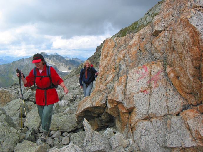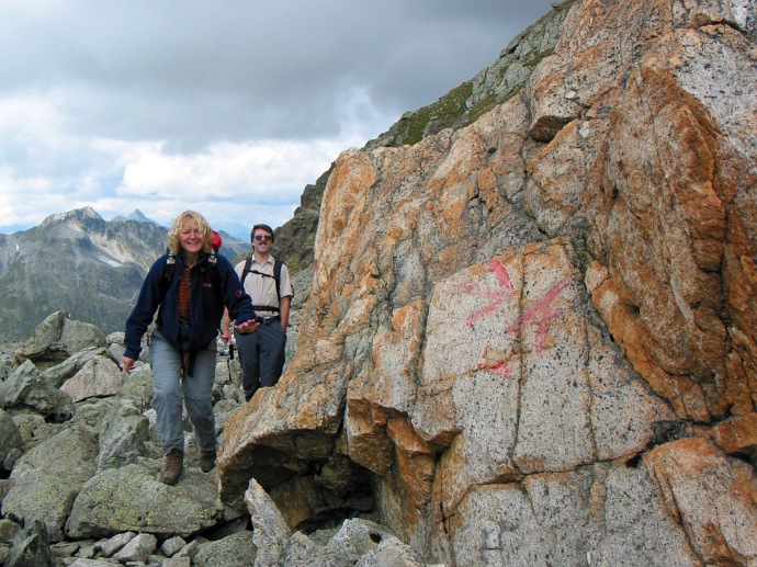 Nachdem die Ränzlein geschnürt und huckepack genommen sind, kann es los gehen in Richtung Verwalltal. Nach wenigen Metern unterquert man die beiden hier für ein kurzes Stück zu Tage tretenden Tunnelröhren der Arlbergautobahn und steigt dann stetig auf der rechten Seiten eines Bergbächleins (Rosanna) stetig an zur (neuen) Konstanzer Hütte. Das trübe, später regnerische Wetter ersparte den beiden Fotografen zunächst einen allzu üppigen Verbrauch an Filmmaterial bzw. elektronischen Speicherplatz. Die heimelige Atmosphäre der Konstanzer Hütte und das liebevoll gekochte Hüttenessen ließen aber die Strapazen und das lausige Wetter bald wieder vergessen. Anzuraten ist, für die manchmal langen Hüttenabende ein Kartenspiel oder ein ähnliches dem geselligen Beisammensein dienendes Spiel mitzunehmen.