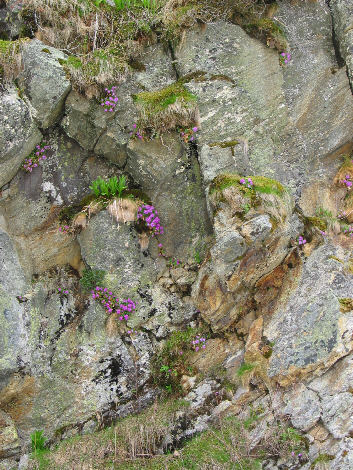 Der Abhang am Wegesrand beherbergt eine Kolonie von Pinguicula vulgaris (gemeines Fettkraut)