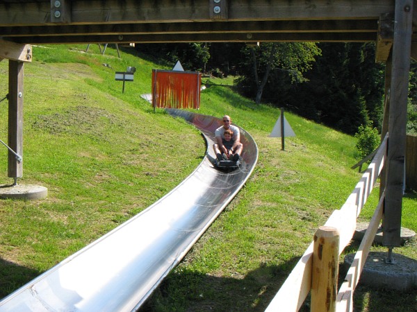 Wir hüpfen über die Sommerrodelbahn von Innerlaterns und steigen dann die mäßig steile Bergflanke hoch.