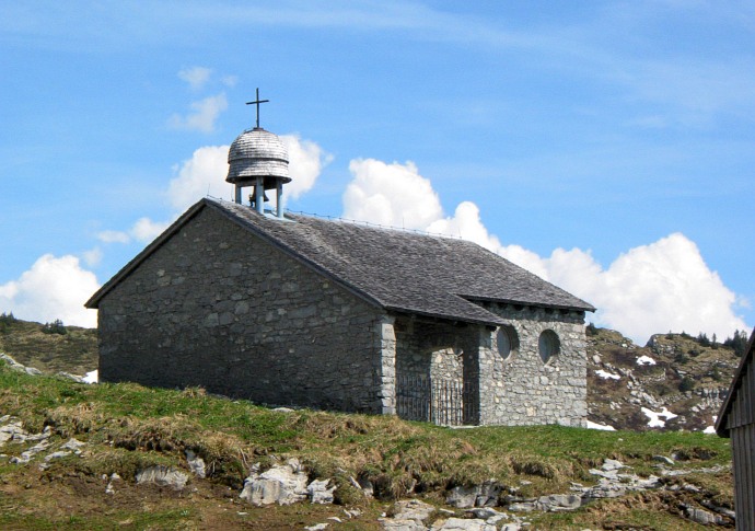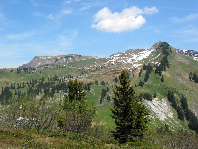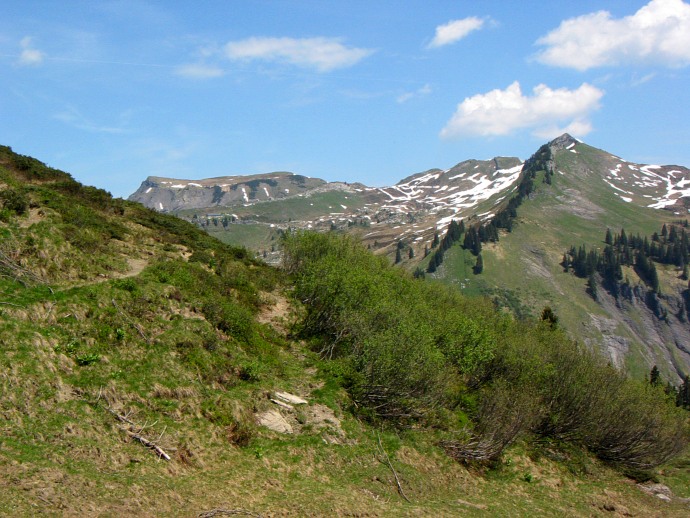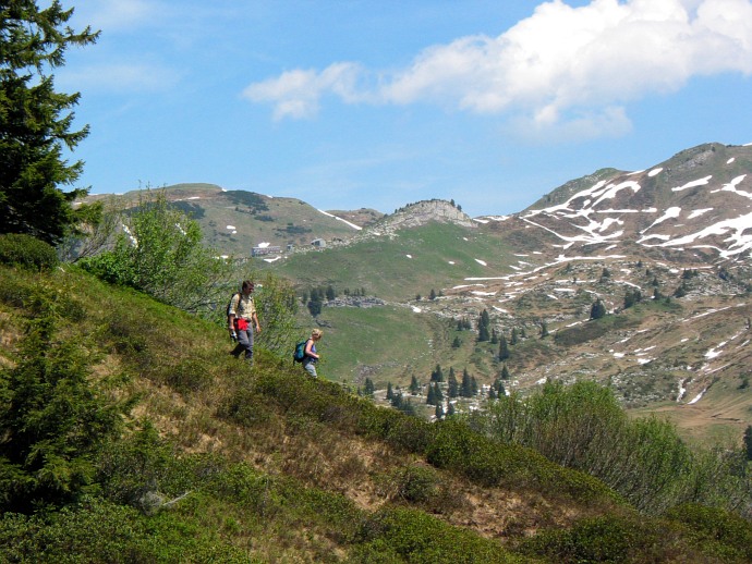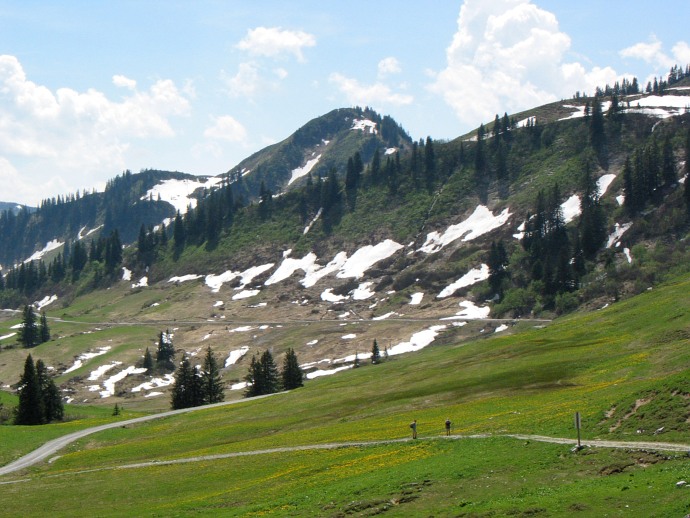An der Gapfohl-Alm vorbei erreichen wir das Gapfohl Fürggele, eine Passhöhe, von der aus der Hohe Freschen bereits zu sehen ist.