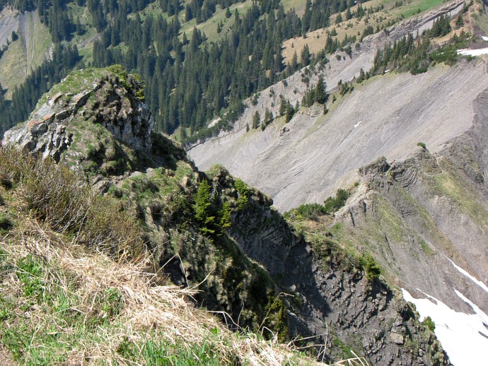 Aber auch hier ist bald Ende der Fahnenstange. Es wird immer steiler und es ist nicht zu erkennen, ob unten nicht doch noch ein unüberwindbarer Abbruch folgt. So kehren wir halt nochmals um, erklimmen wieder das Plateau und steigen zum regulären Weg ab. Aber ein schönes Abenteuer war es doch!