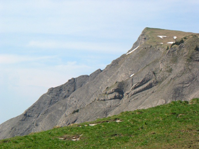 Vom Rastplatz aus sieht es so aus, als ob der Trampelpfad direkt über den Kamm Richtung Hohen Freschen führen würde. Zunächst ist der Weg auch noch gut erkennbar, verliert sich dann aber, es wird immer nasser und wir haben auch einige klatschnasse Schneereste zu durchqueren. Nur noch eine letzte Anhöhe, denken wir, und es wird wieder besser, aber weit gefehlt. Der Kamm ist so steil, dass es zu riskant erscheint weiter zu gehen.
