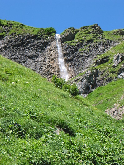 Auf der anderen Seite des Baches ragt die Mohnenfluh auf.