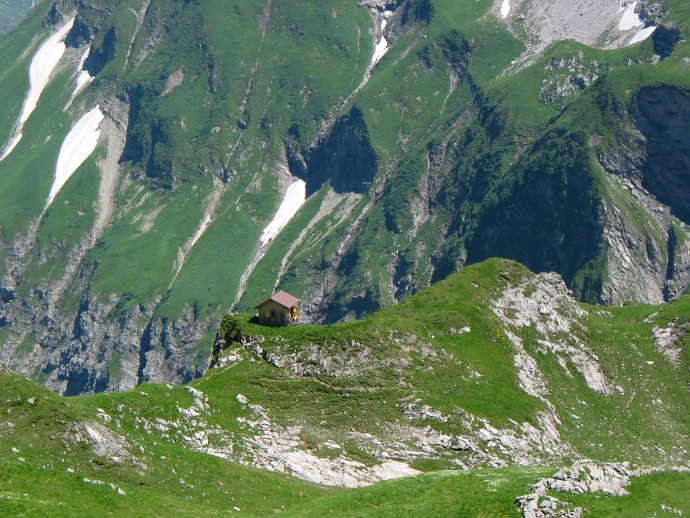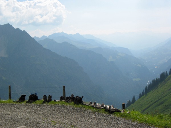 Bei Schröcken suche ich mir einen Parkplatz direkt an der Stelle, wo der Wanderweg anfängt. Leider steht dort zu lesen, dass der riesige Parkplatz Privateigentum der nebenstehenden Gaststätte/Pension ist. So frage ich im Haus nach und bekomme als Antwort, dass es wohl erlaubt ist, den Wagen dort abzustellen, es aber als Gegenleistung gern gesehen wird, wenn man nach Ende der Tour kurz auf einen Kaffee in der Wirtschaft einkehrt.