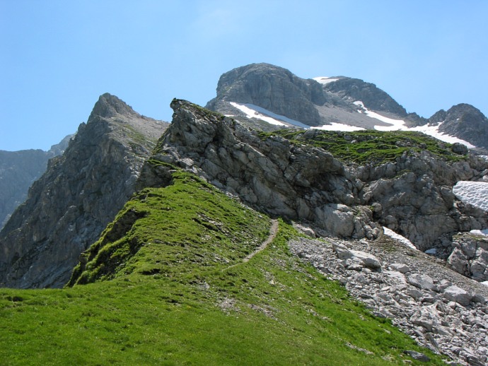 Der Weg im Hang führt weiter zur Biberacher Hütte.